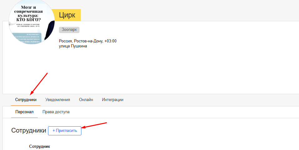 Если у вас есть сотрудники, которым необходим доступ к системе и мониторинг продажи билетов, то добавьте их в разделе «Профиль компании» - «Сотрудники» - «Персонал» и нажмите на кнопку “+ Пригласить”.