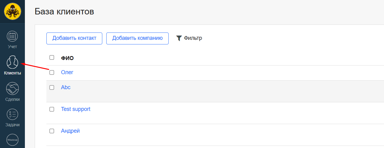 Для перехода в данный раздел, на панели слева нажмите на кнопку «Клиенты».