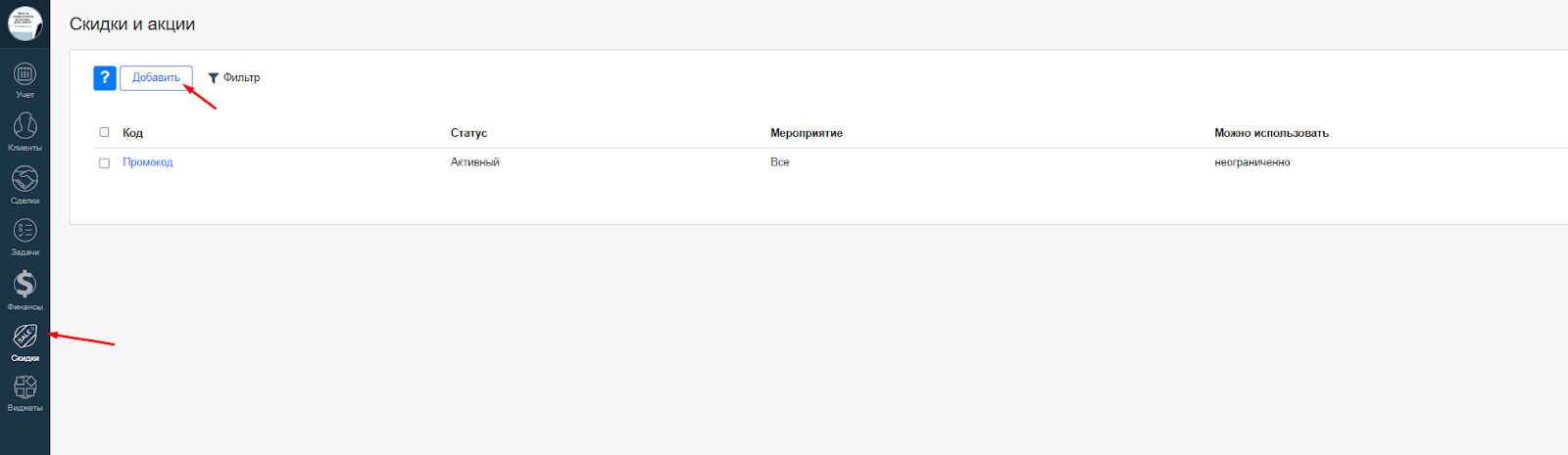 Для того чтобы перейти в данный раздел на левой панели нажмите на кнопку «Скидки», а в этой статье можно узнать о детальной настройке промокодов