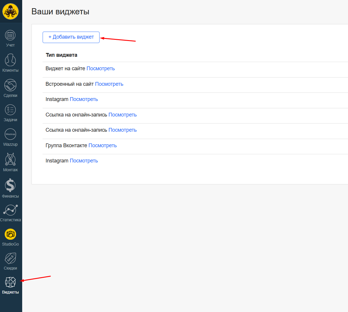В данном разделе настраиваются виджеты, которые в дальнейшем могут быть установлены на ваш сайт, в группу ВКонтакте и прочие, необходимые ресурсы.