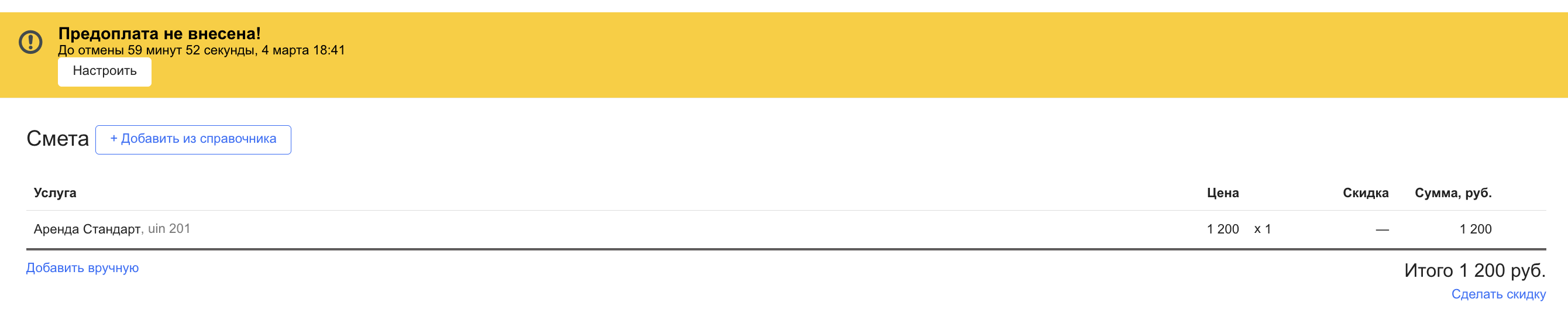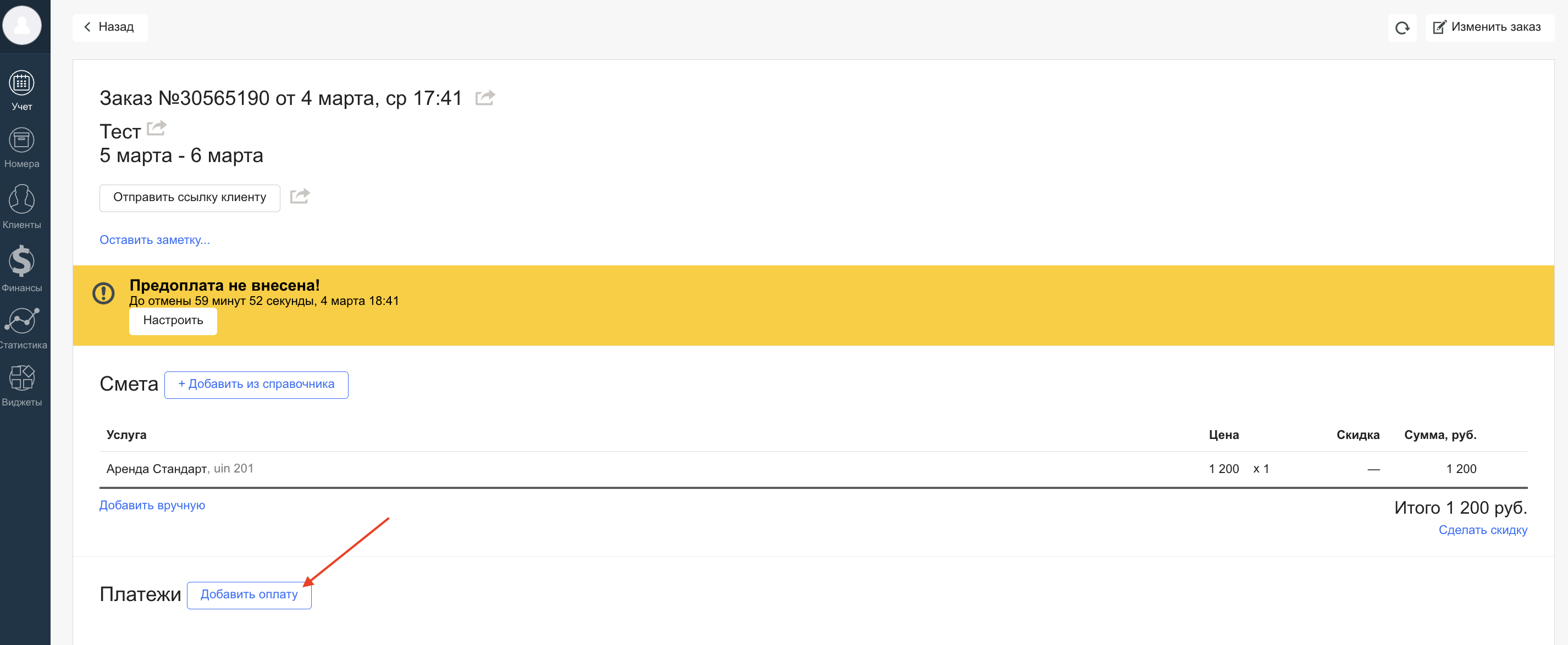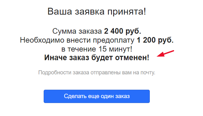 Если автоотмена настроена, то в заказе появится системное уведомление «Предоплата не внесена!», а также будет указан срок, в течение которого клиент должен внести оплату.