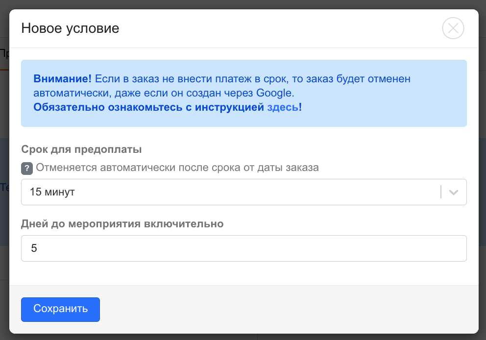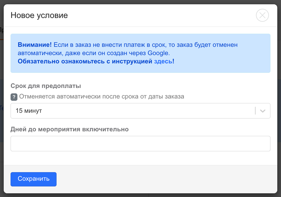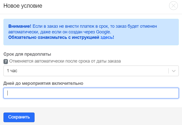 Если ваши клиенты часто бронируют «впритык» — за час или меньше до начала мероприятия — устанавливайте срок автоотмены не более 30 минут. Так вы избежите автоматической отмены срочных заказов.