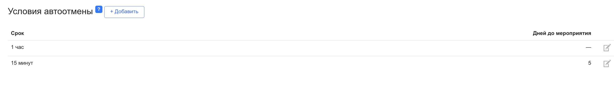 Дней до мероприятия включительно — позволяет применять разные сроки автоотмены в зависимости от того, сколько дней осталось до начала мероприятия.