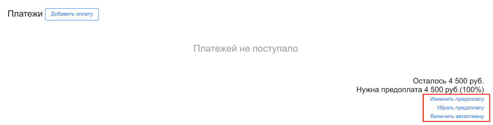 чтобы избежать отмены, необходимо внести оплату вручную или отправить клиенту ссылку на онлайн‑оплату.