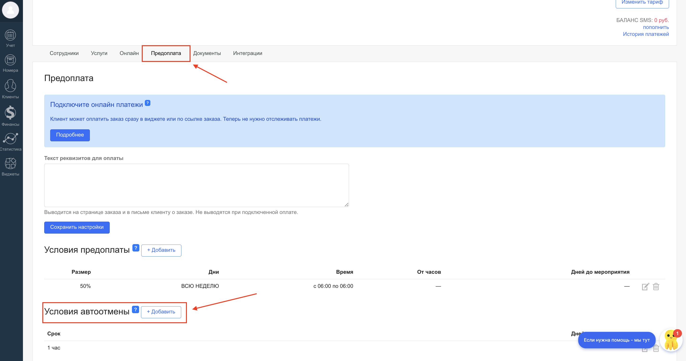 Важно: автоотмена работает только при наличии условий предоплаты. Как настроить предоплату — в статье «Настройка условий предоплаты».