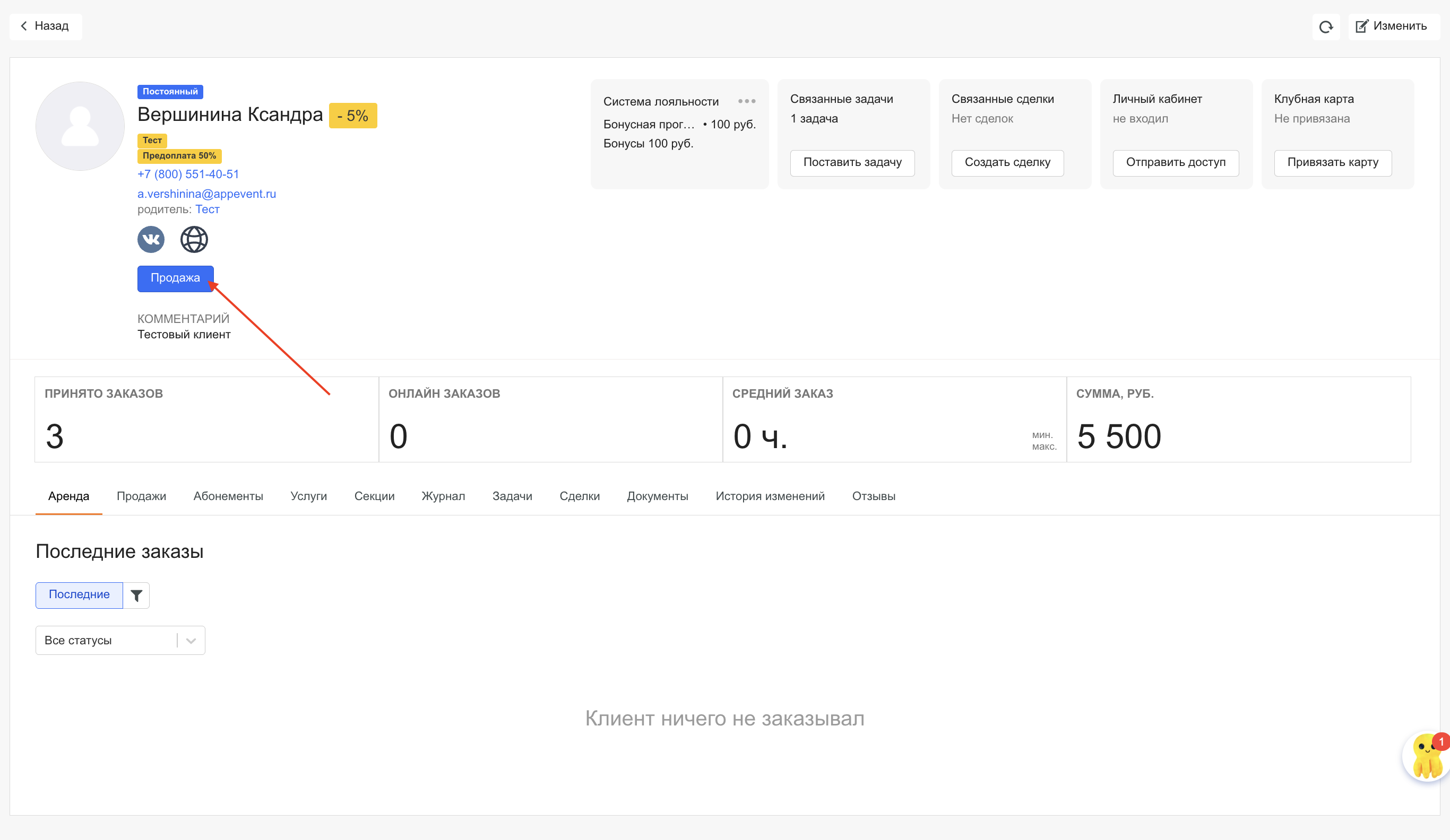 В карточке клиента есть кнопка «Продажа», через которую можно оформить: