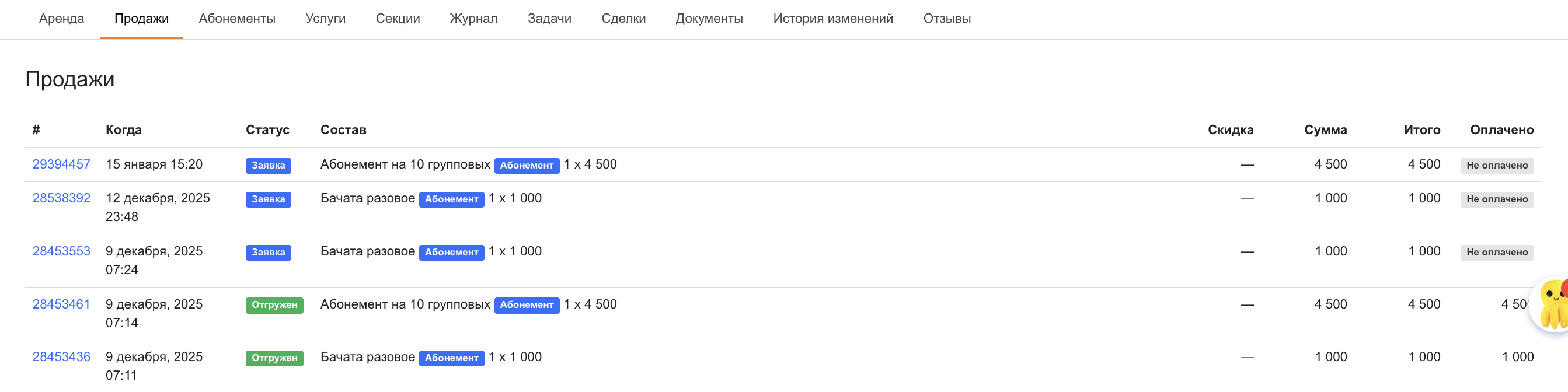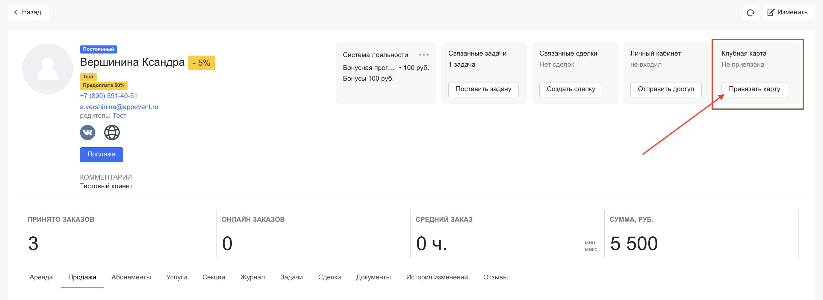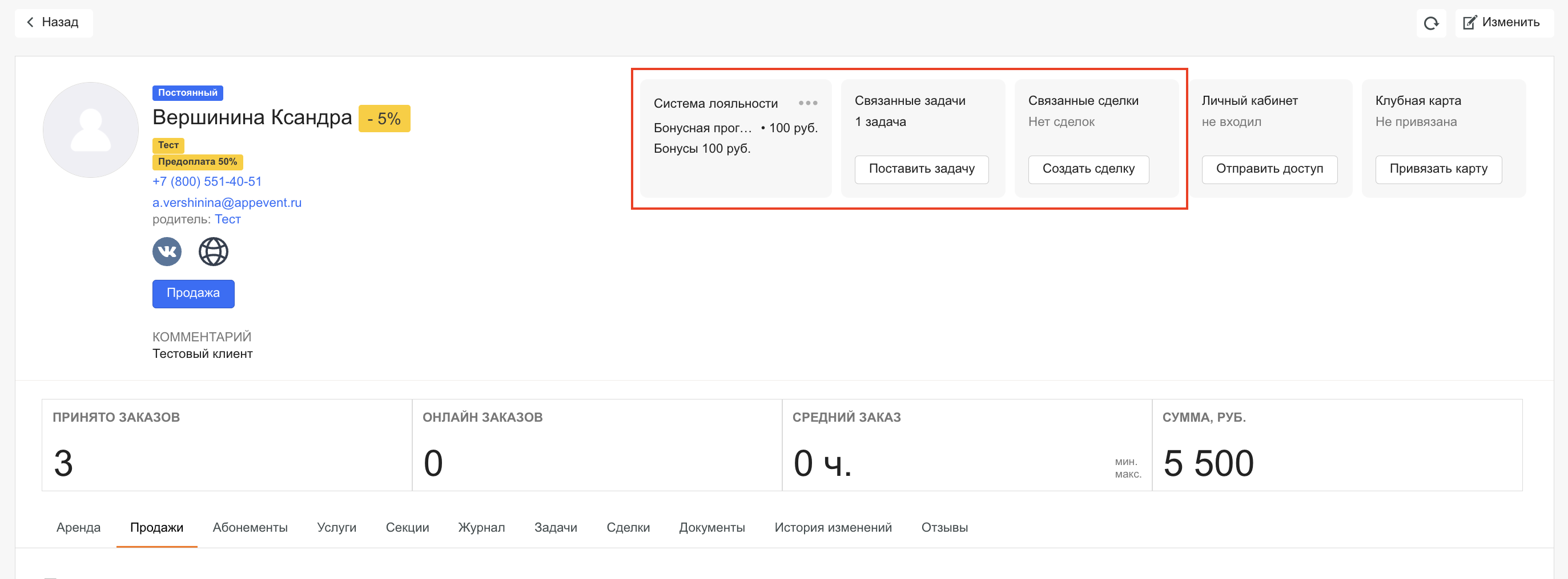 Карточка клиента содержит всю информацию о клиенте, его активности, покупках, документах и взаимодействиях с компанией. Здесь можно просматривать данные, редактировать их, оформлять продажи, управлять доступом в личный кабинет и работать с абонементами.