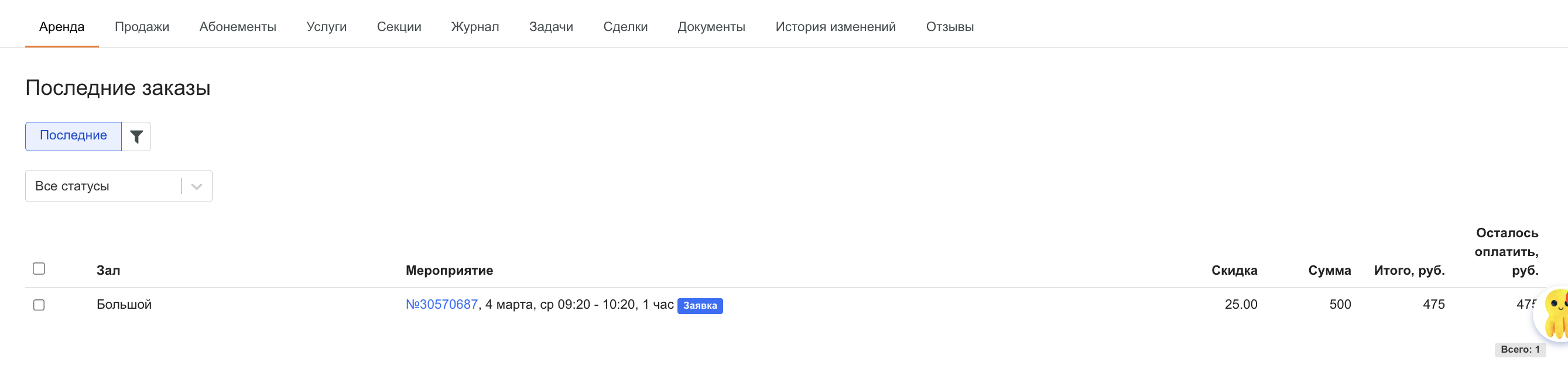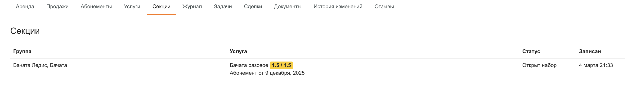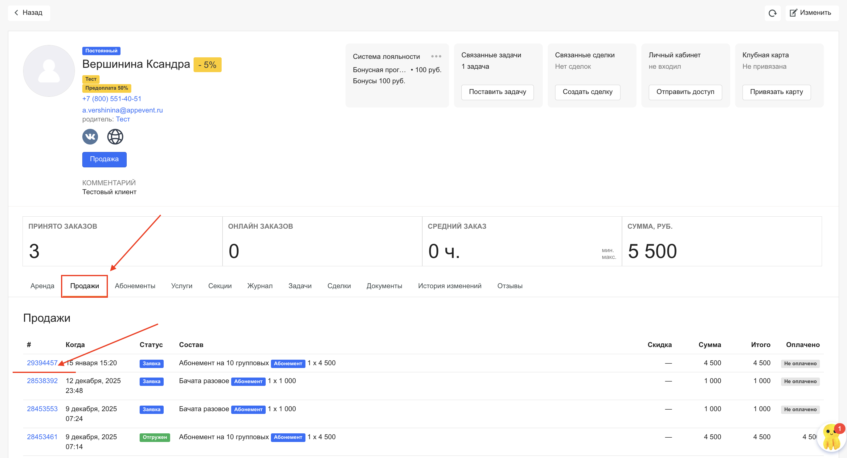 Карточка клиента содержит всю информацию о клиенте, его активности, покупках, документах и взаимодействиях с компанией. Здесь можно просматривать данные, редактировать их, оформлять продажи, управлять доступом в личный кабинет и работать с абонементами.