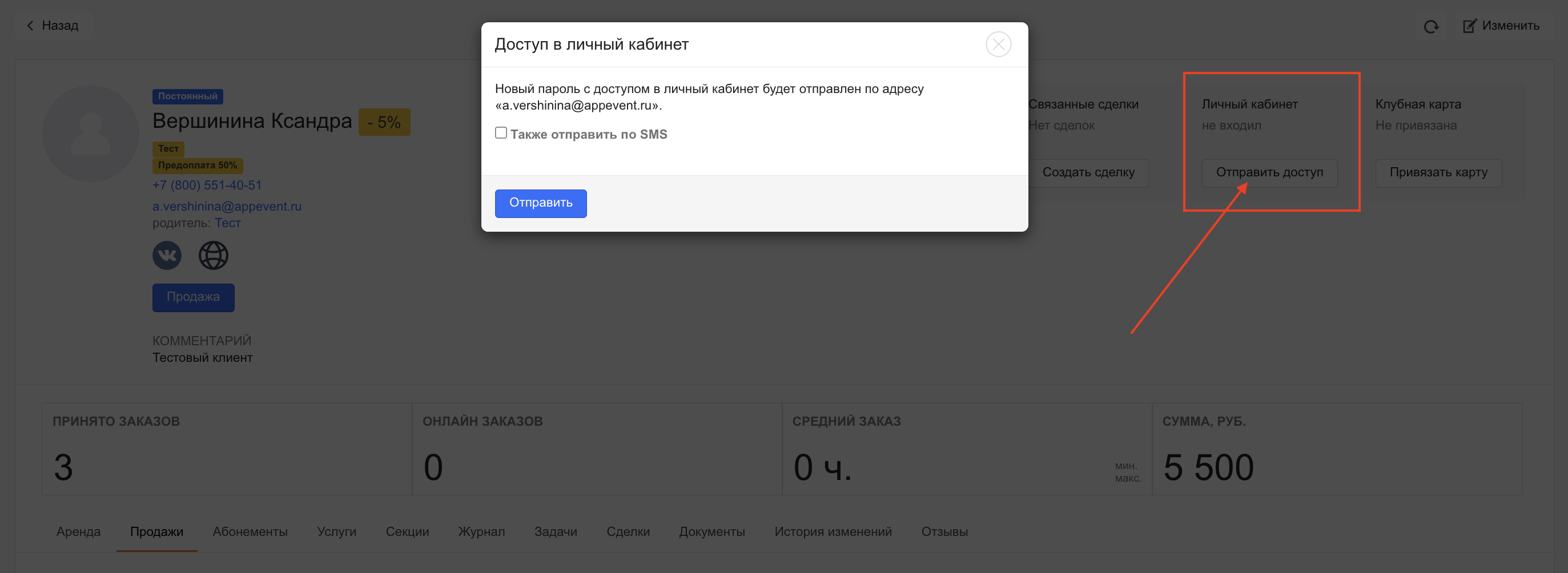 Кнопка «Отправить доступ» позволяет отправить клиенту пароль для входа в личный кабинет. Пароль можно отправить: