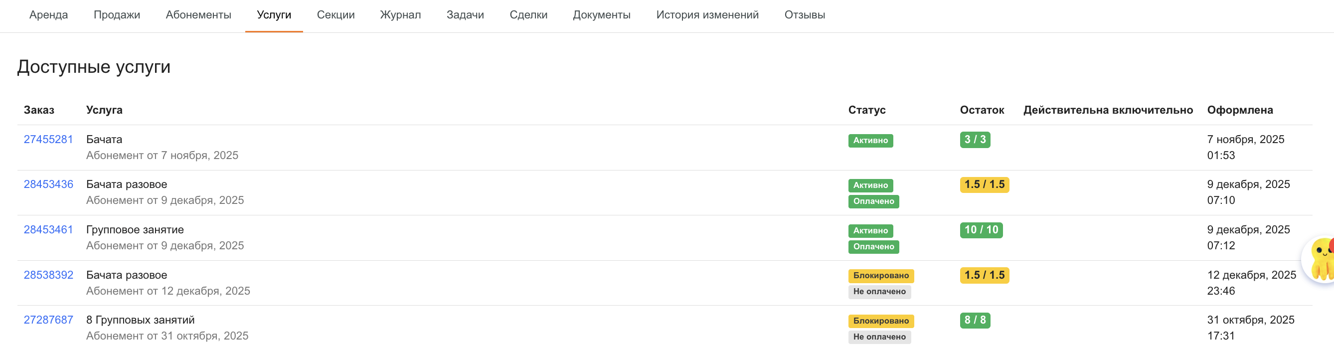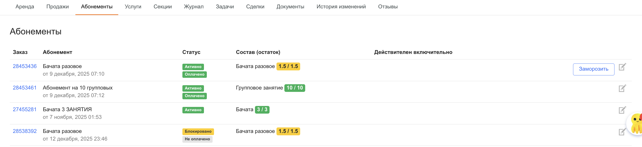 Подробная информация по каждому абонементу: номер заказа, название абонемента, статус, состав, срок действия, доступные посещения.