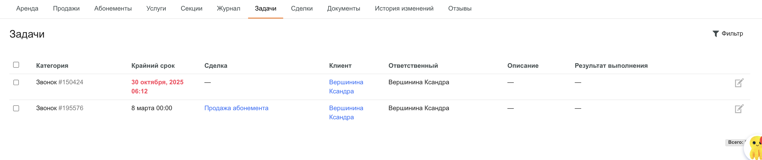 Связанные задачи — задачи, назначенные на клиента, подробнее в статье «Задачи».