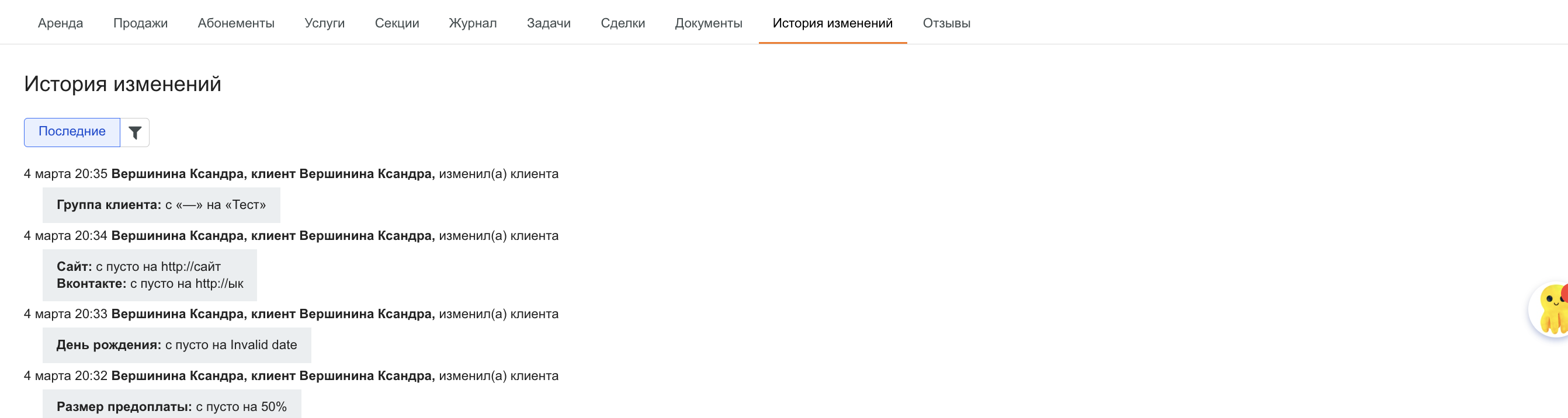 Отображает все изменения, внесённые в карточку: кто изменил, что изменил и когда.