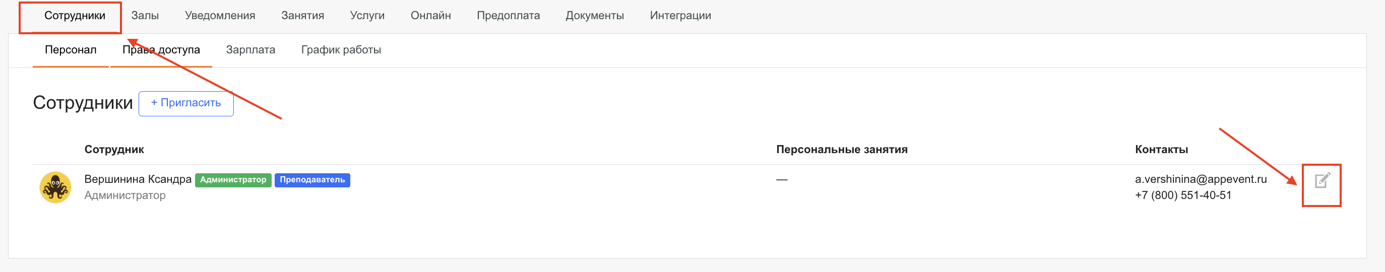 администратор сможет назначать преподавателя при создании персональной тренировки в разделе «Учёт». Подробнее о том, как вносить персональные тренировки в расписание — в этой статье.