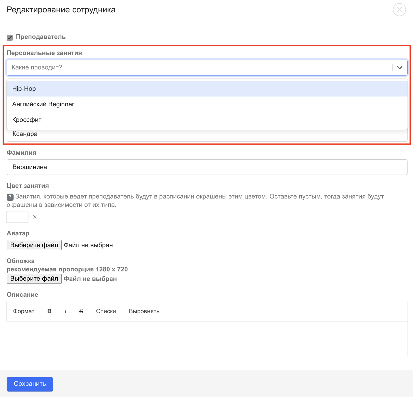 В поле «Персональные занятия» выберите занятия, которые он проводит.
