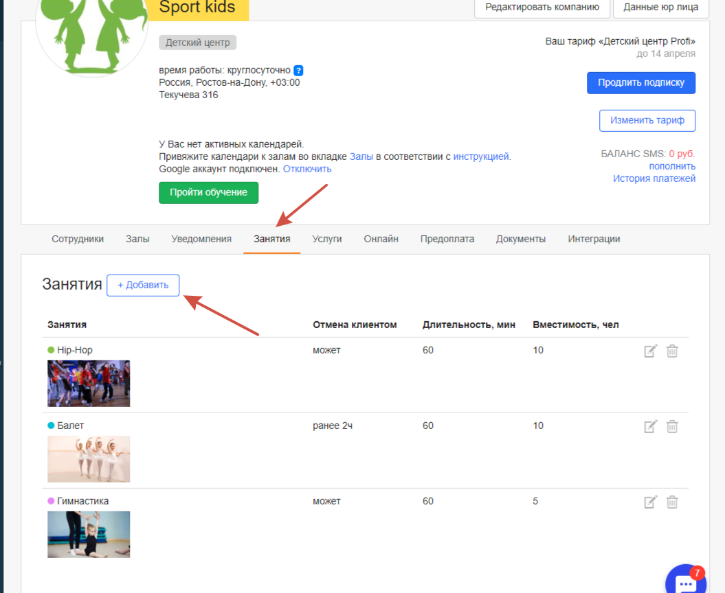Чтобы добавить занятия, перейдите в «Профиль компании» — «Занятия» и нажмите кнопку «Добавить».
