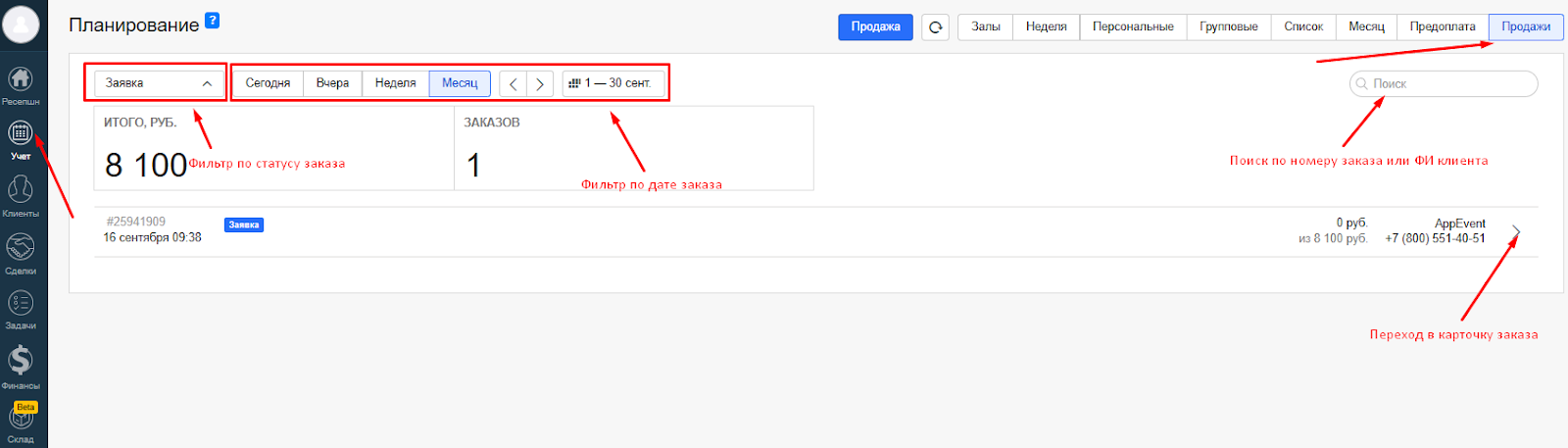 Если выбрать «Внесён по ошибке», заказ не будет отображаться во вкладке «Продажи» у клиента.