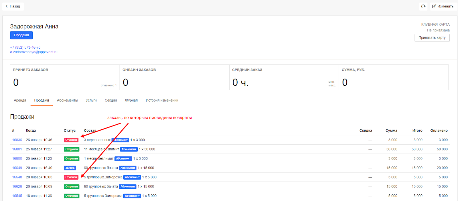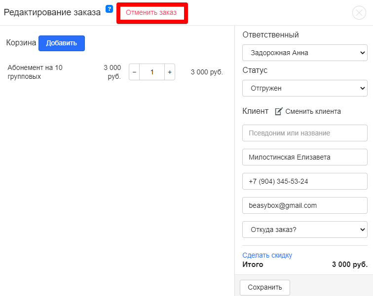 «Клиенты» → вкладка «Аренда» / «Продажи» / «Абонементы» / «Услуги» → Номер заказа → «Изменить заказ» → «Отменить заказ»