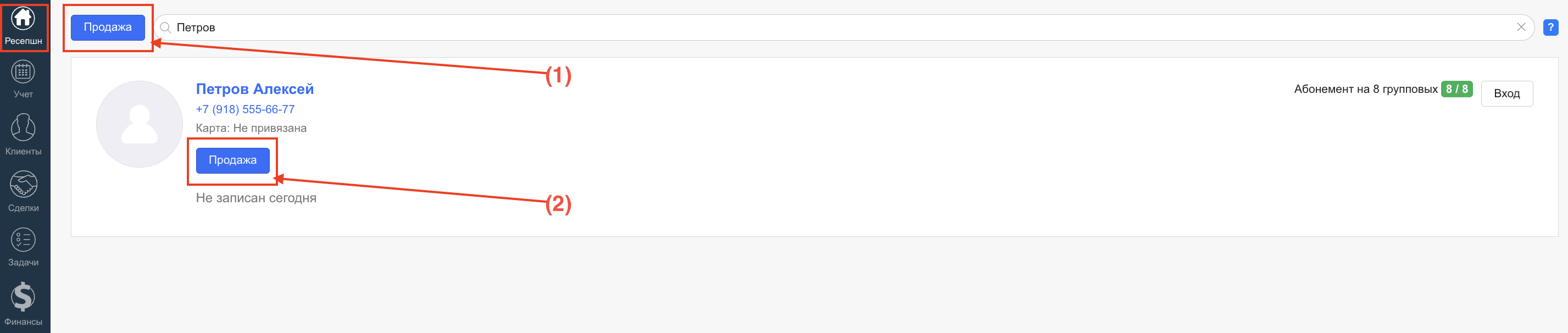Кнопка «Продажа» (1) — расположена рядом со строкой поиска. Она позволяет оформить продажу услуги или абонемента для любого клиента, даже если вы ещё не выбрали его в списке. Подходит для ситуаций, когда клиент стоит перед вами, но вы ещё не нашли его в базе.