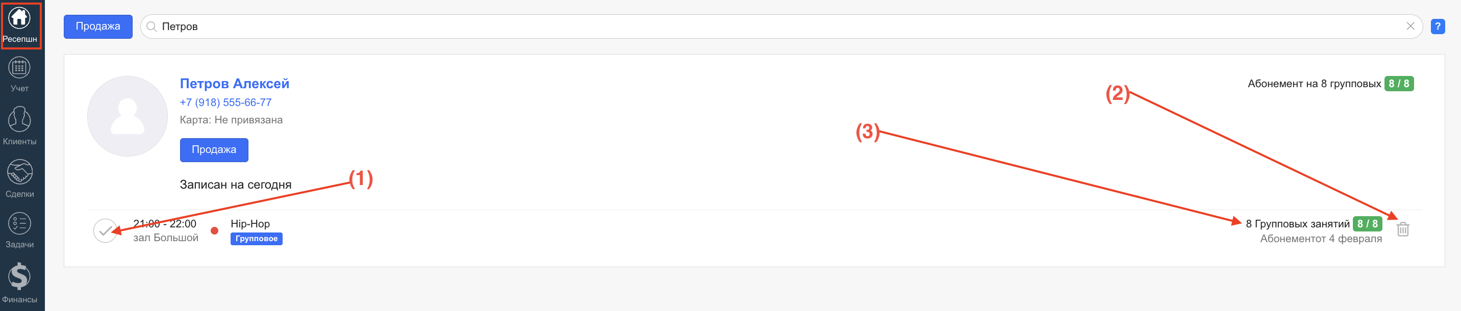 Если клиент записан на занятие на текущий день, его запись автоматически появится в дашборде. Далее вы можете: