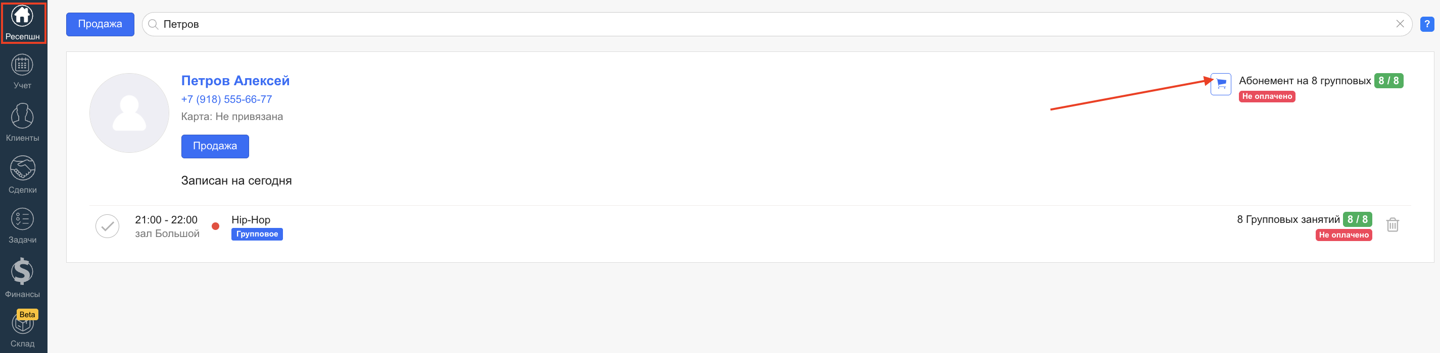 Раздел «Ресепшн» объединяет все ежедневные задачи администратора в одном интерфейсе, поэтому работа с клиентами, посещениями и продажами становится быстрее и удобнее.