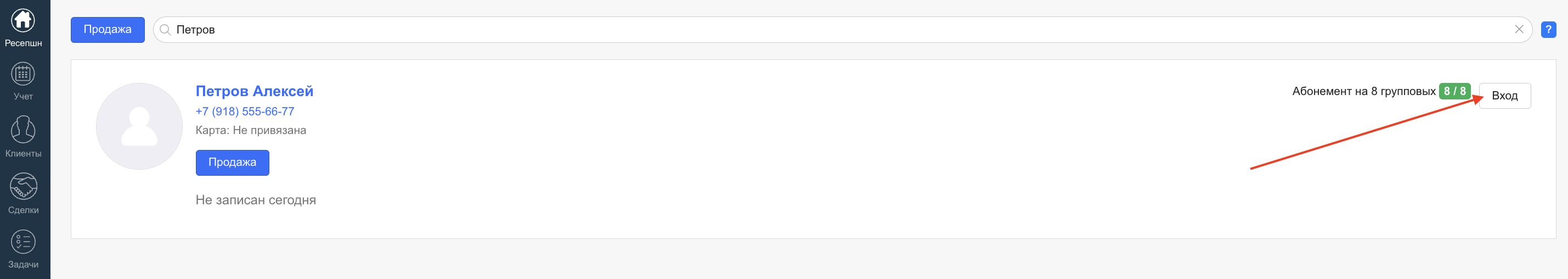Если в вашей студии предусмотрено свободное посещение зала без записи на конкретное занятие, вы можете отметить визит клиента через кнопку «Вход». После нажатия система зафиксирует время входа и предложит выбрать услугу или абонемент, по которому будет фиксироваться посещение.