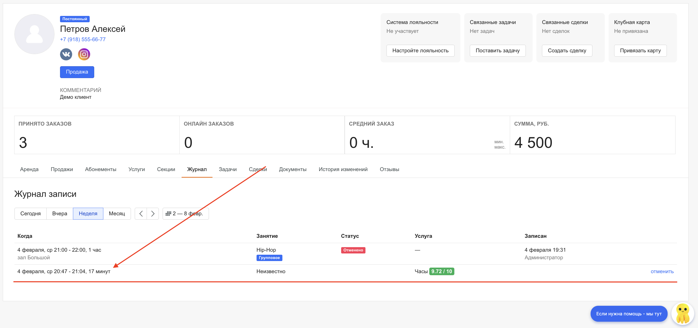 Отследить статистику свободных посещений можно в карточке клиента, во вкладке «Журнал». В журнале будет отображена дата и время пребывания клиента в зале. В поле «Занятие» такое посещение будет отмечено как «Неизвестно», а также будет указана услуга, по которой фиксировалось посещение.