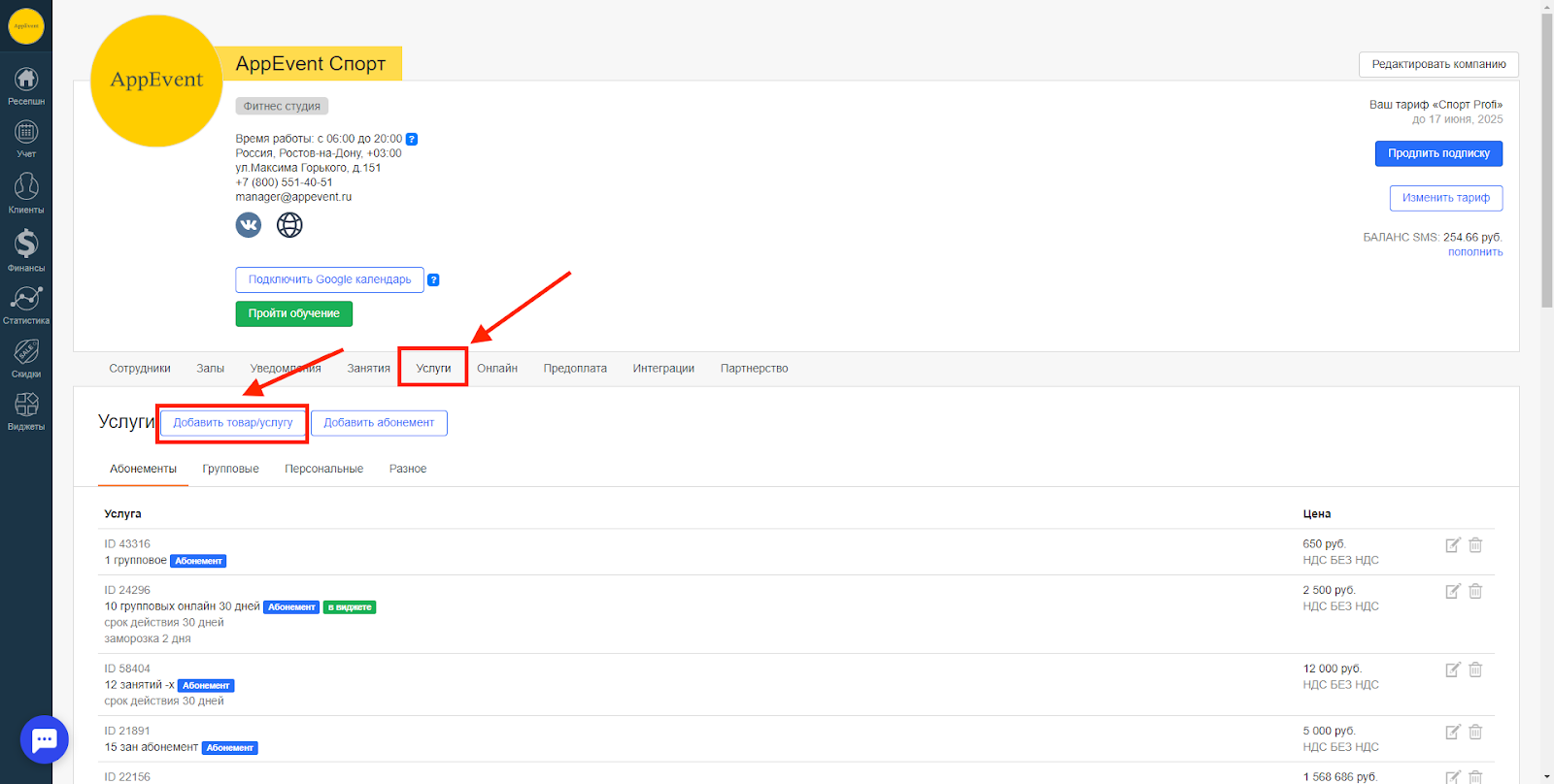Перед созданием абонемента необходимо настроить услуги, которые будут в него входить.