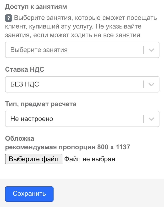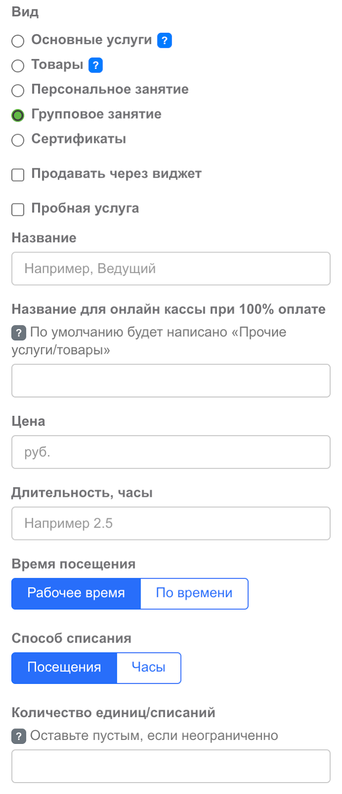 Определяет, как клиент сможет использовать услугу и какие поля появятся для заполнения. От выбранного вида зависит логика списания, доступ к занятиям и отображение услуги в системе.