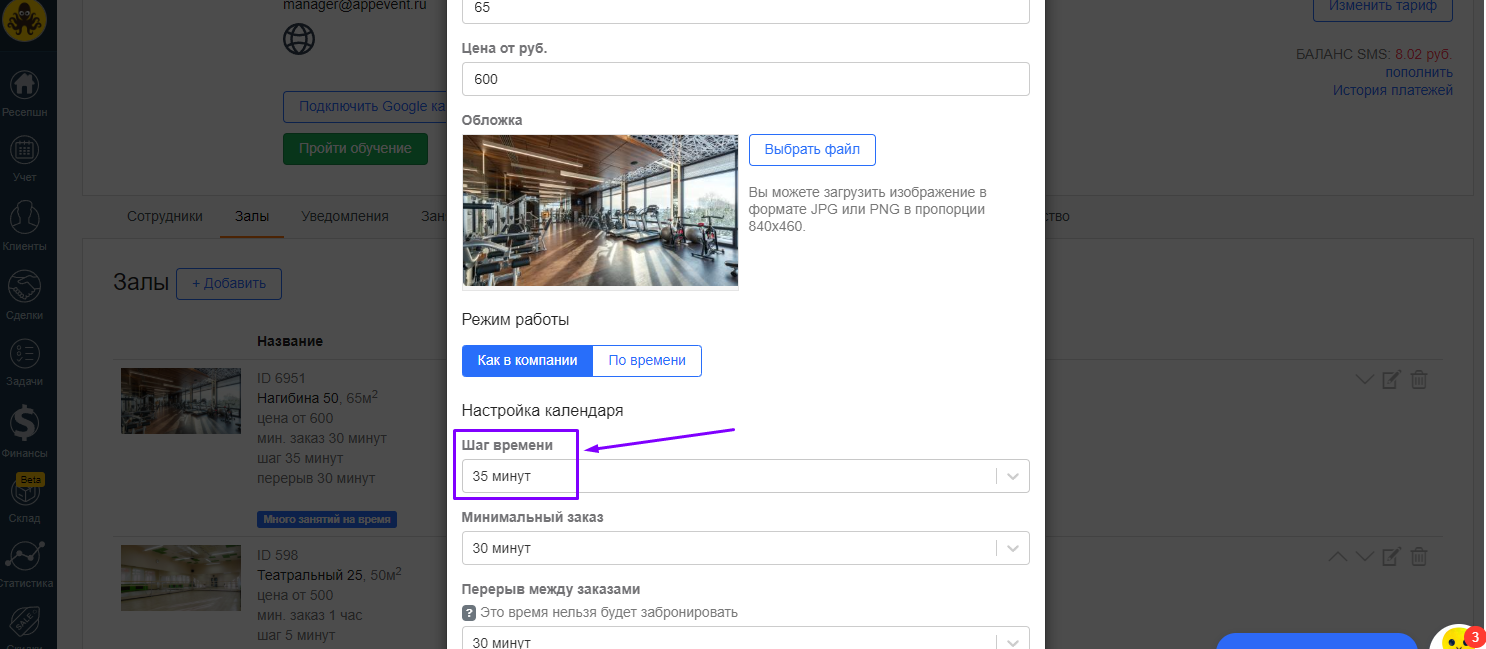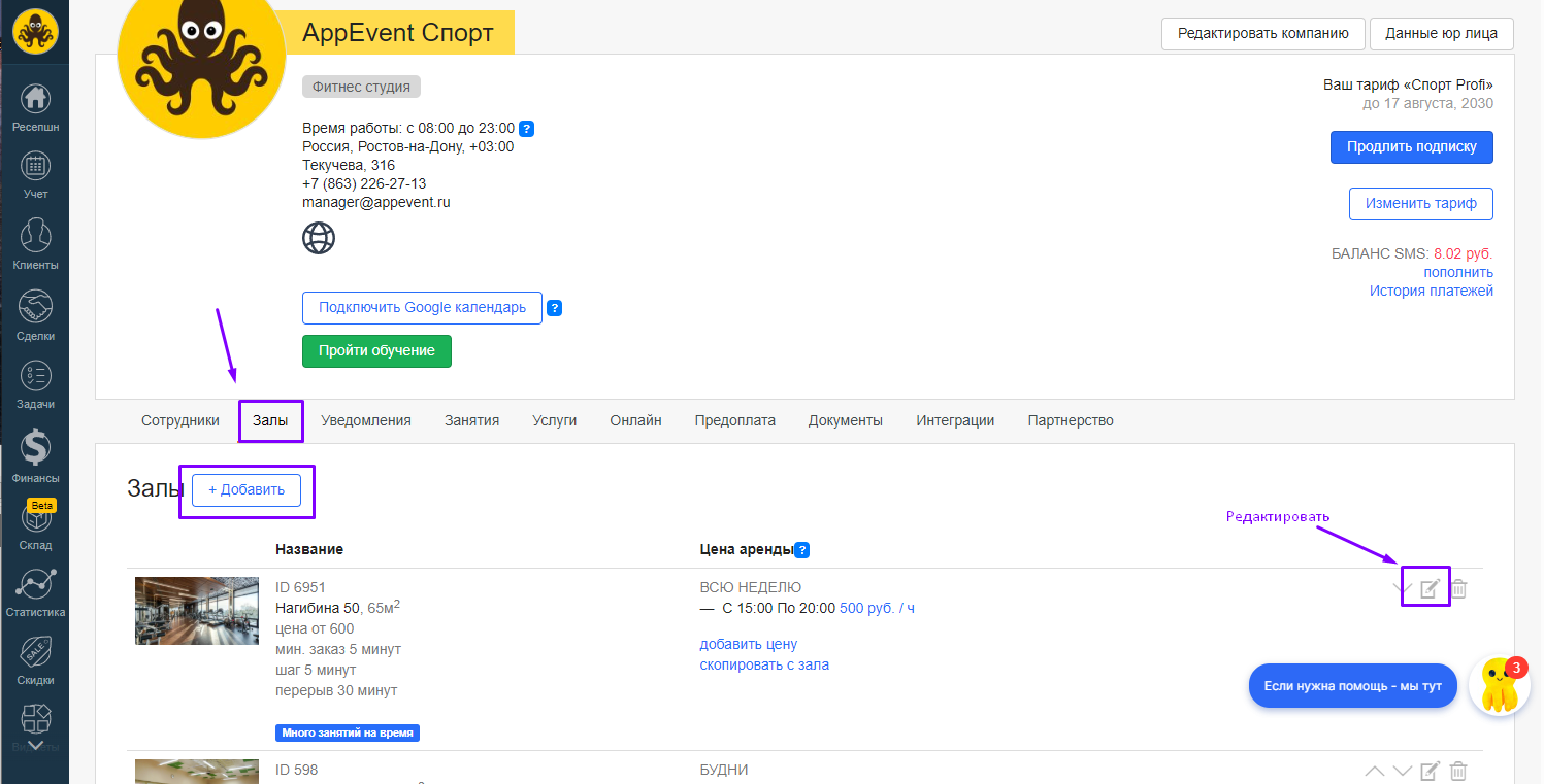 Для сдачи залов в аренду, настройте их стоимость как описано в нашей статье