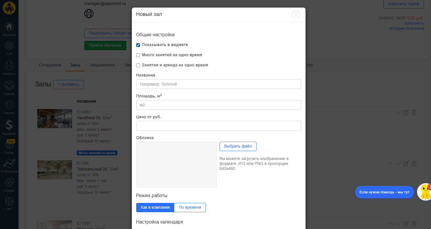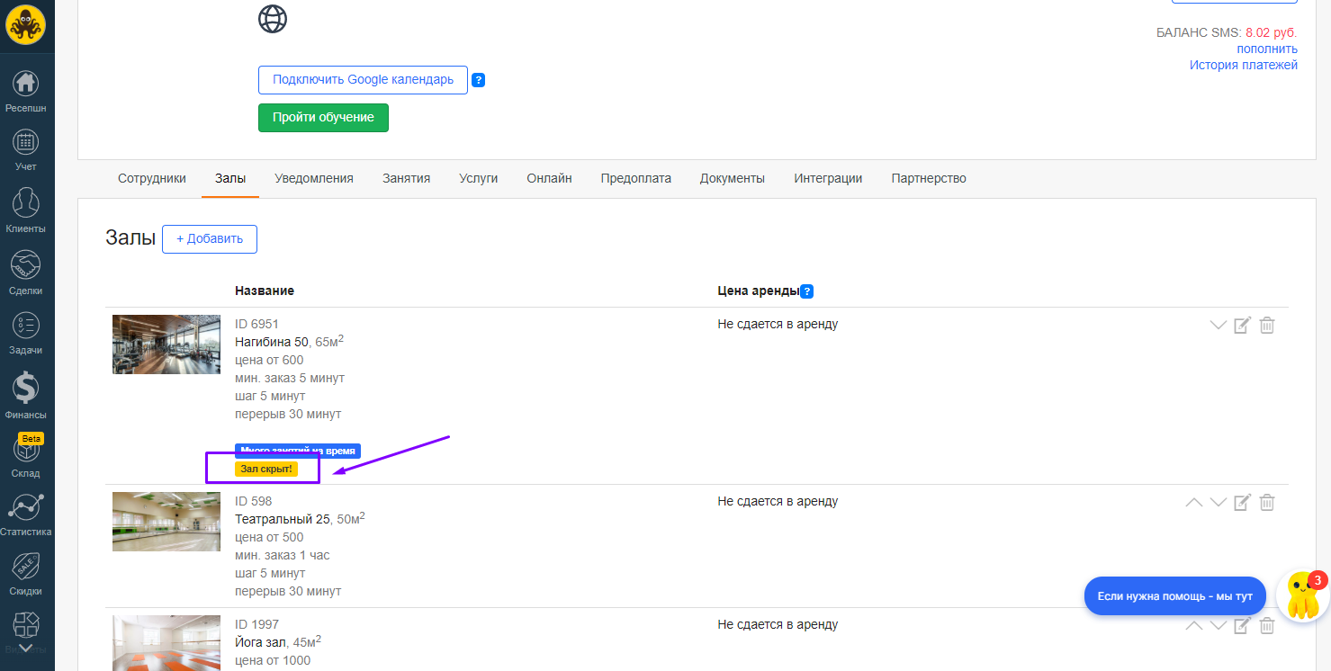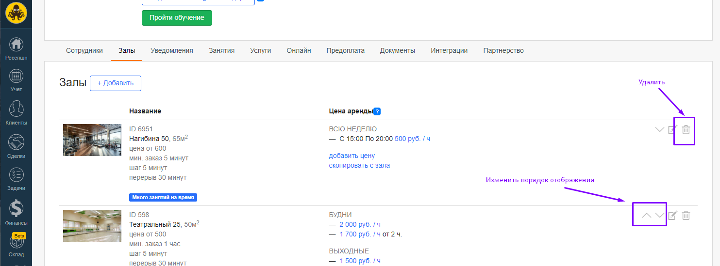 «Показывать в виджете» — клиенты могут бронировать данный зал для аренды через виджет или мобильное приложение (для тарифа «Спорт и детский центр», начиная с «Optima»). Если убрать чекбокс, то у зала появится пометка «Зал скрыт!».