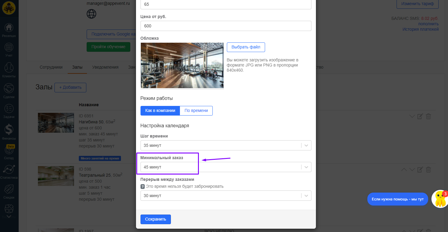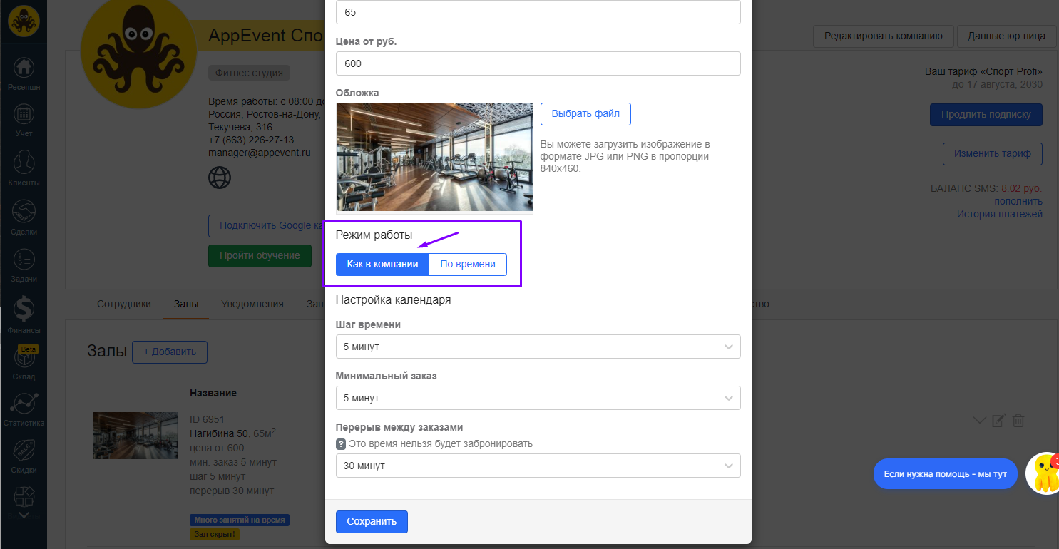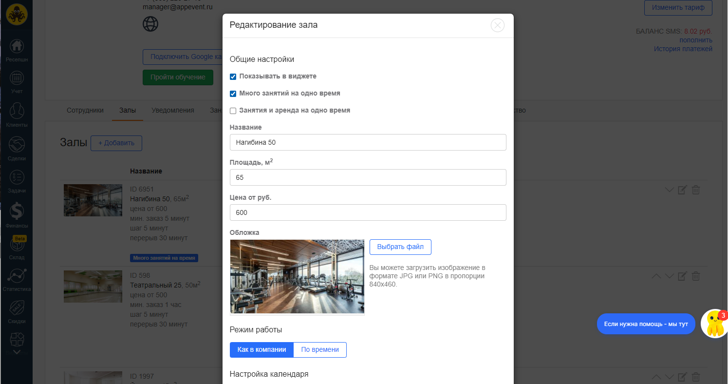 «Показывать в виджете» — клиенты могут бронировать данный зал для аренды через виджет или мобильное приложение (для тарифа «Спорт и детский центр», начиная с «Optima»). Если убрать чекбокс, то у зала появится пометка «Зал скрыт!».