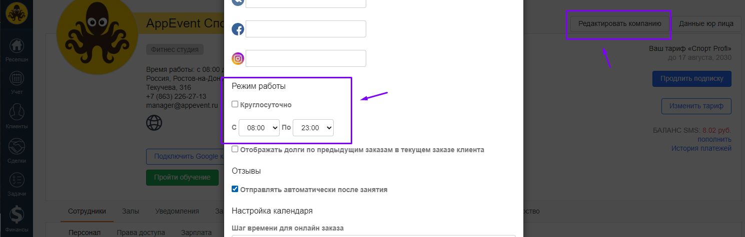 Как в компании — время автоматически будет приравнено к тому, которое задано в разделе «Профиль компании» — «Редактирование компании» — поле «График работы».