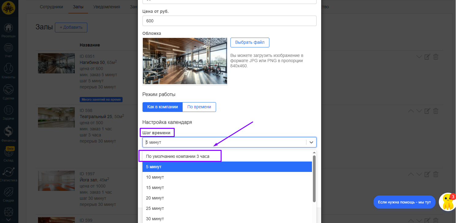 «Шаг времени» — можно выбрать от 5 минут до 3 часов и «по умолчанию компании … минут/часа»