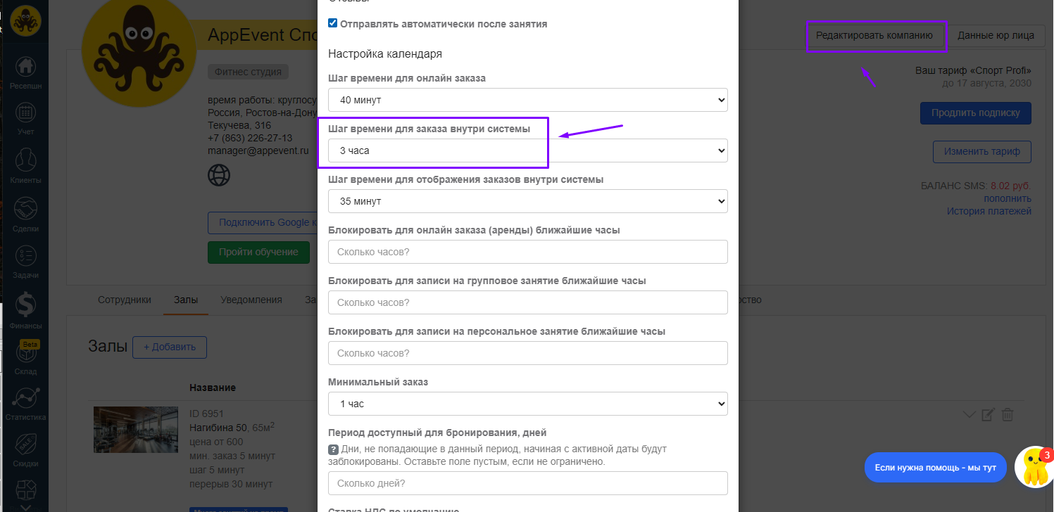 «по умолчанию компании … минут/часа» — время в данный параметр подтягивается из раздела «Профиль компании» — «Редактировать компанию» — параметр «Шаг времени для заказа внутри системы»