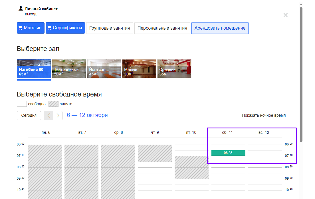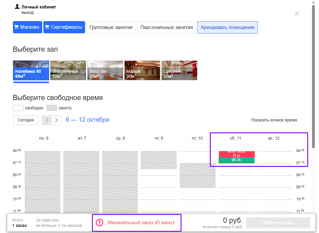«Занятия и аренда на одно время» — если зал может одновременно сдаваться в аренду и иметь возможность для проведения группового или персонального занятия. Обратите внимание, сначала добавляется аренда, потом занятие. В обратном порядке система не даст сохранить заказ аренды.