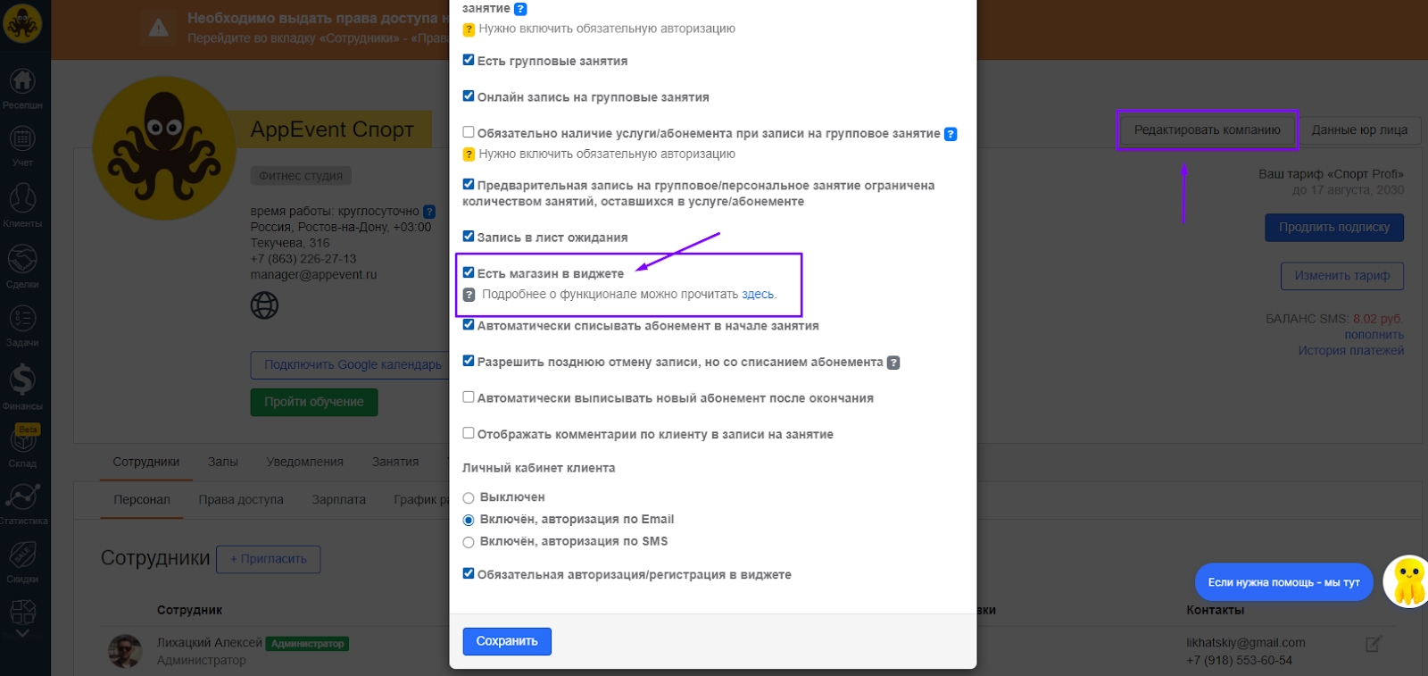 «Профиль компании» → «Редактирование компании» → «Есть магазин в виджете»