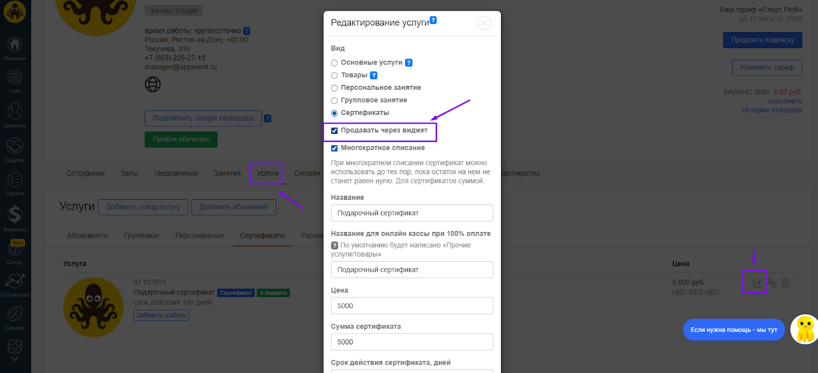 «Профиль компании» → «Услуги» → [позиция] → «Продавать через виджет»