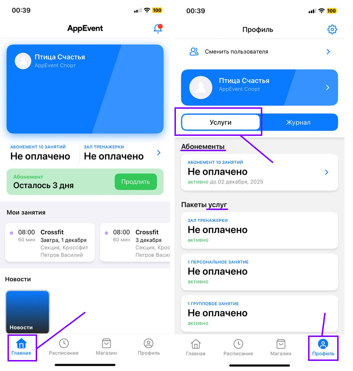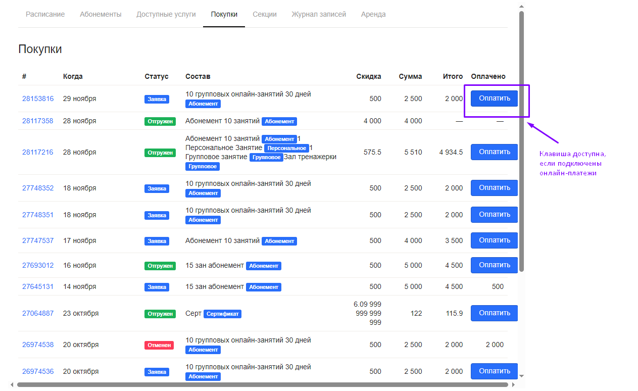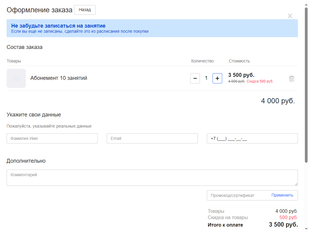 После настройки магазина клиенты смогут самостоятельно покупать услуги, абонементы и товары через виджет и приложение, а система автоматически создаст заказ и чек (при онлайн‑оплате).