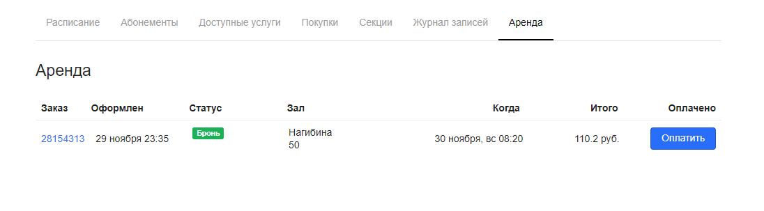 Во вкладке «Аренда» отображаются только заказы аренды, созданные клиентом.