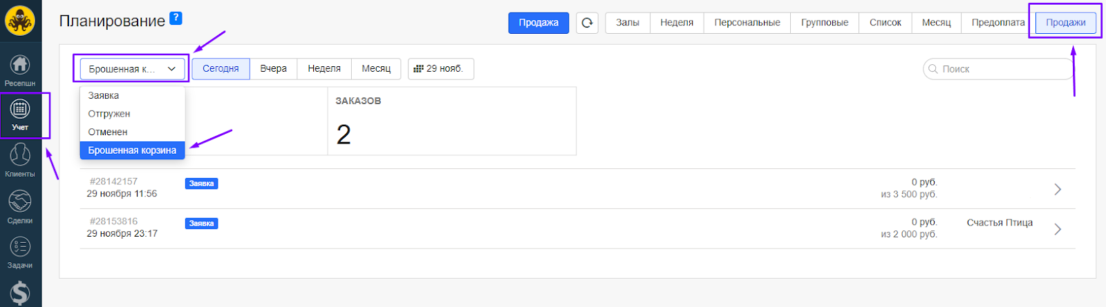 «Учёт» → «Продажи» → статус «Брошенная корзина»