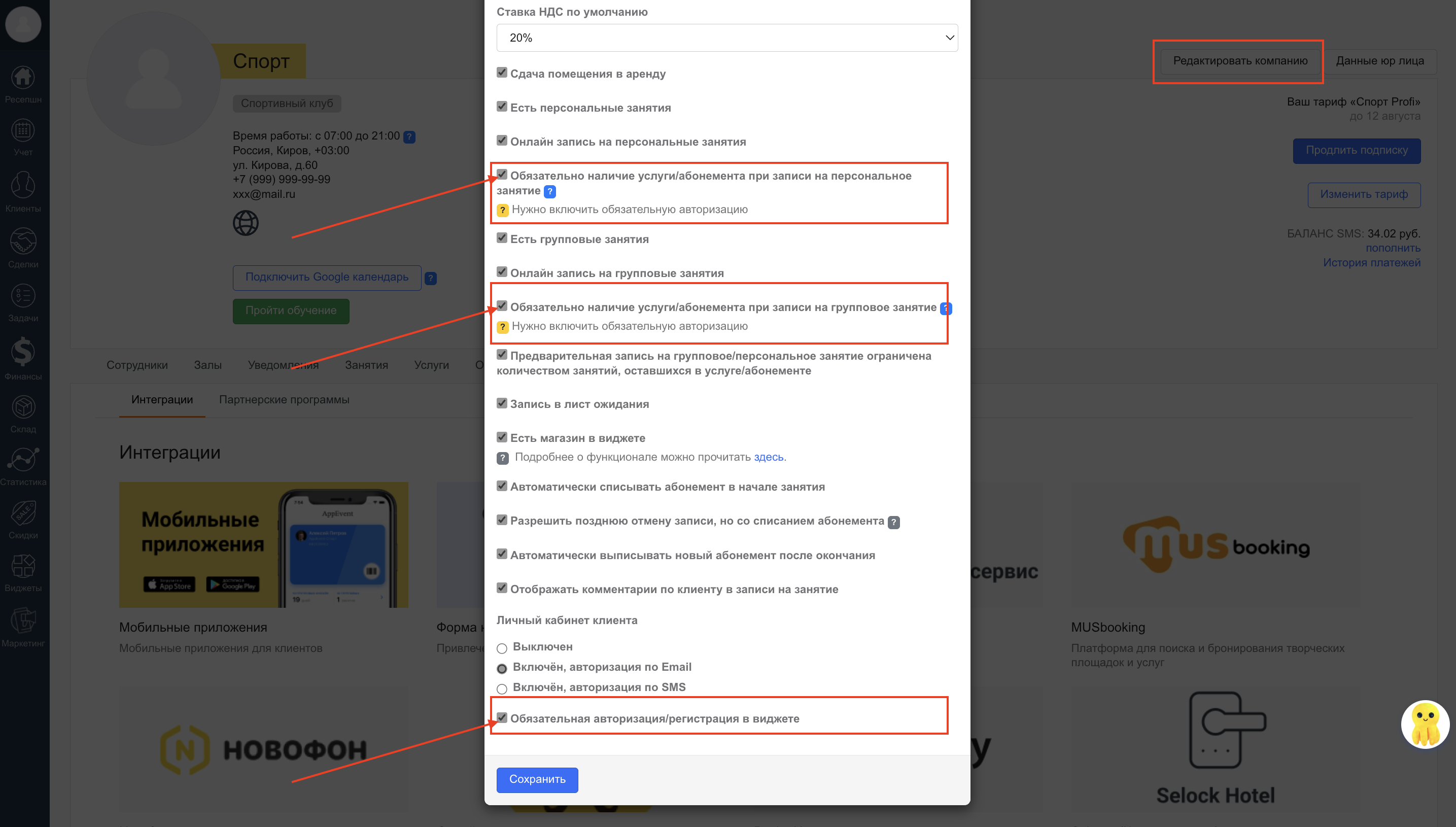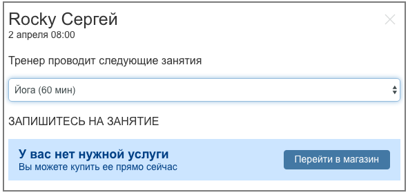 Эти параметры включают проверку наличия услуги при записи на определенное занятие и показывают клиенту окно покупки, если услуги нет.