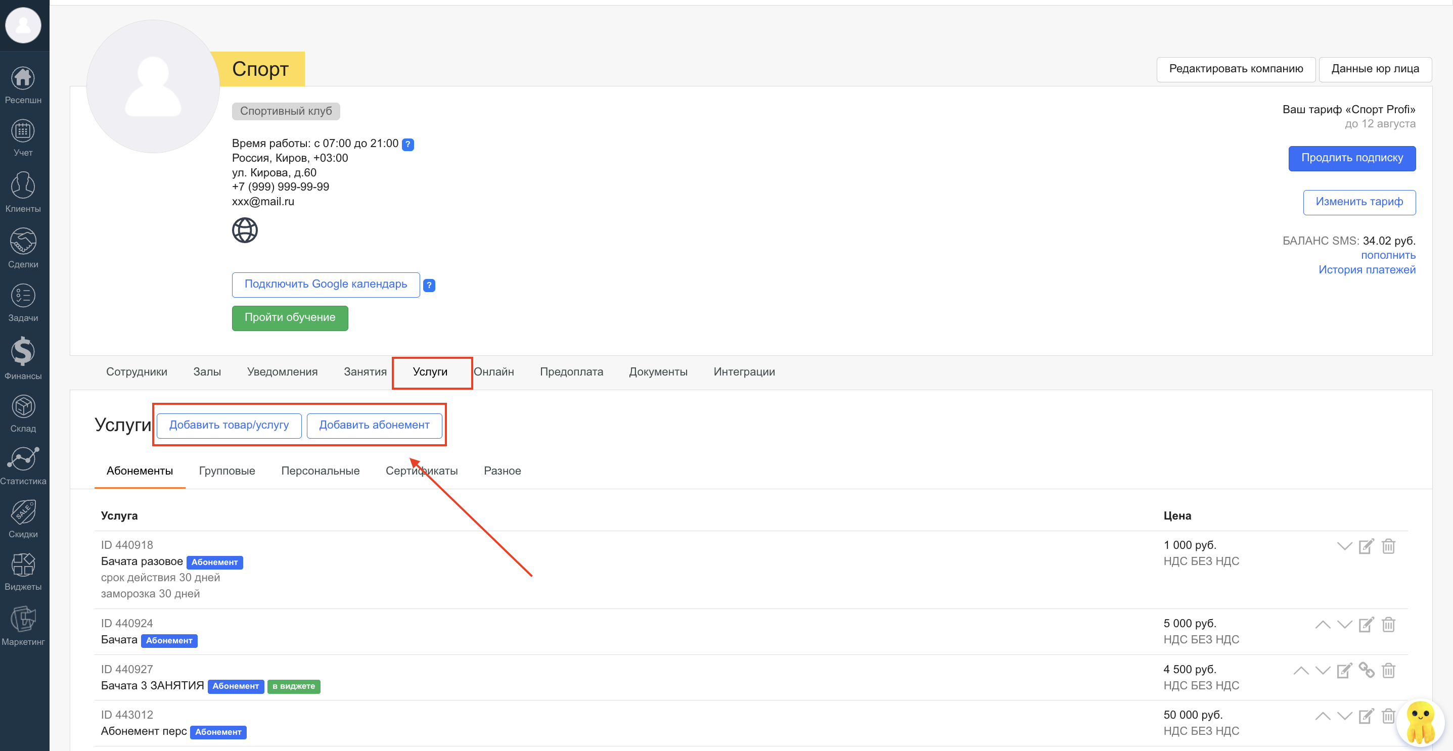 Как добавить услуги и абонементы и подробнее об их настройках в статьях: