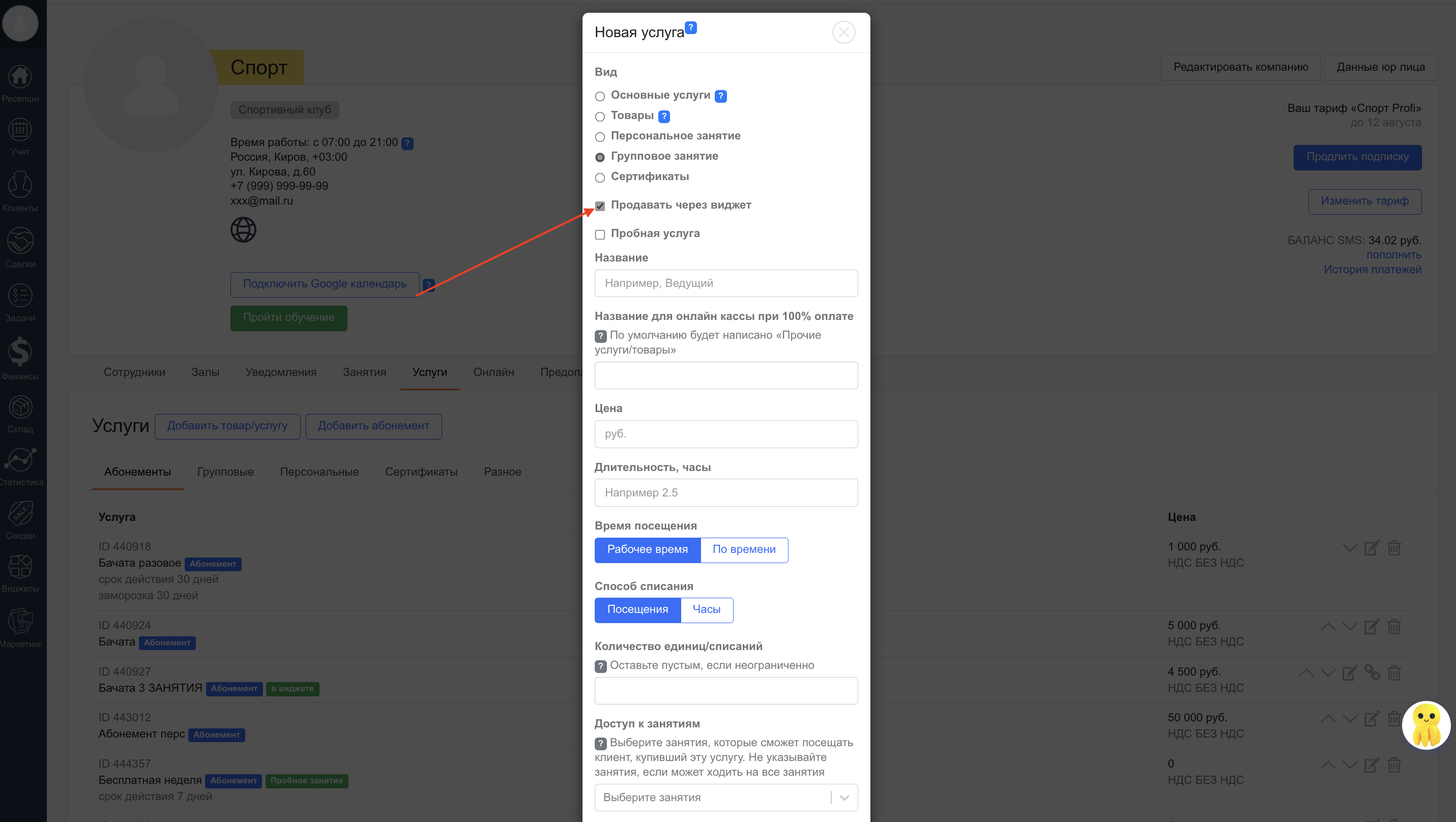 Создайте нужные услуги и абонементы и установите галочку: «Продавать через виджет».