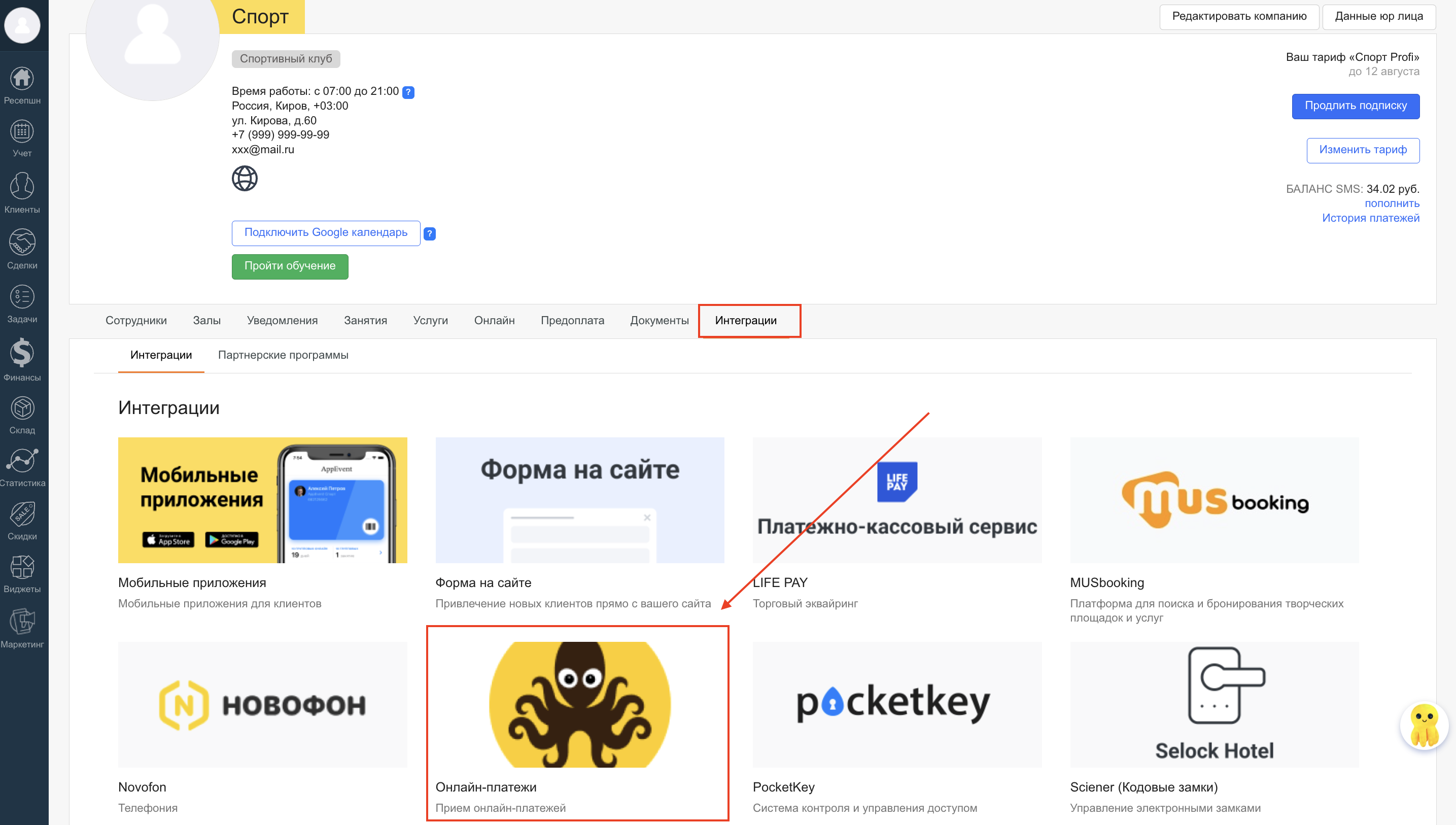 «Профиль компании» → «Интеграции» → «Онлайн‑платежи»