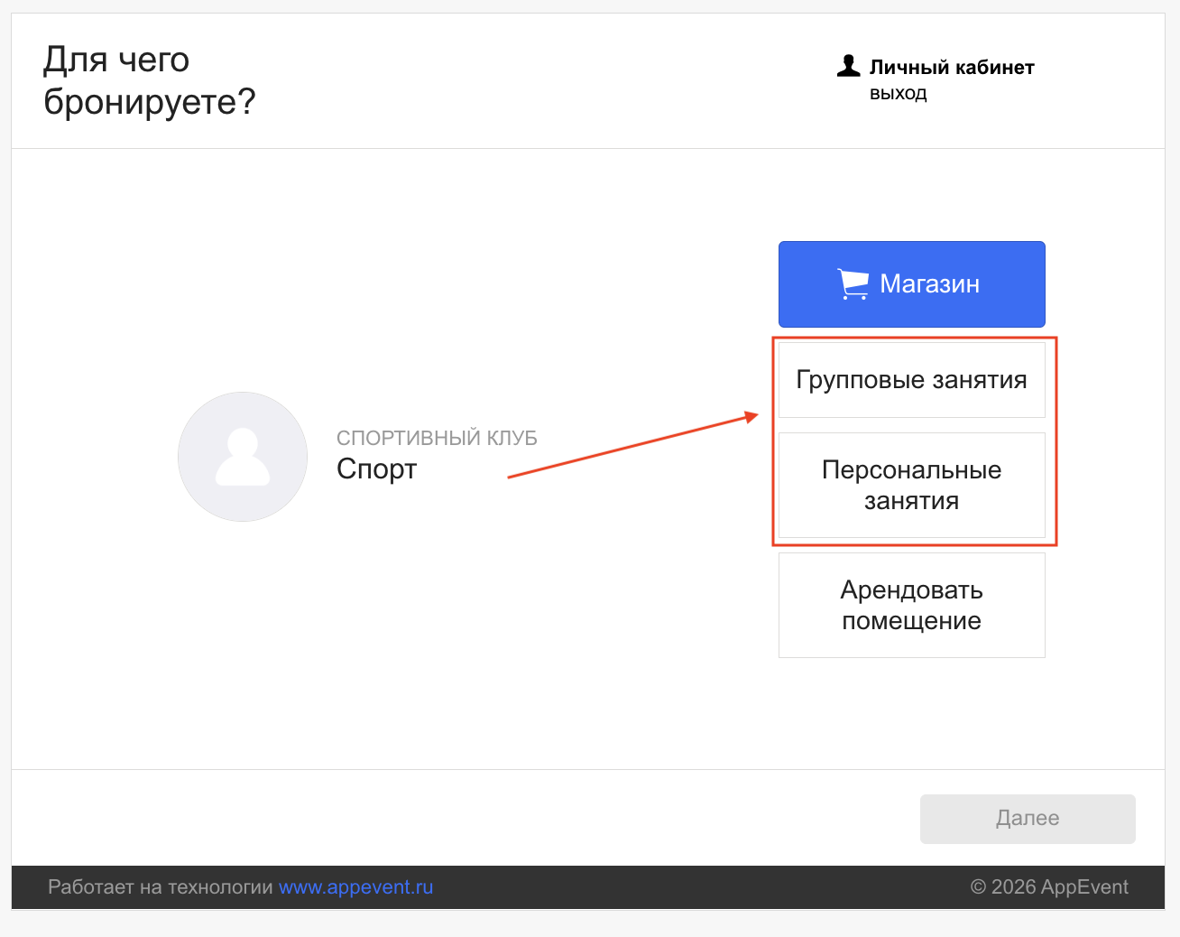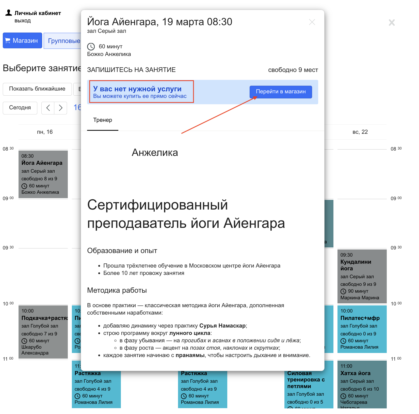 «Обязательно наличие услуги/абонемента при записи на персональное занятие»