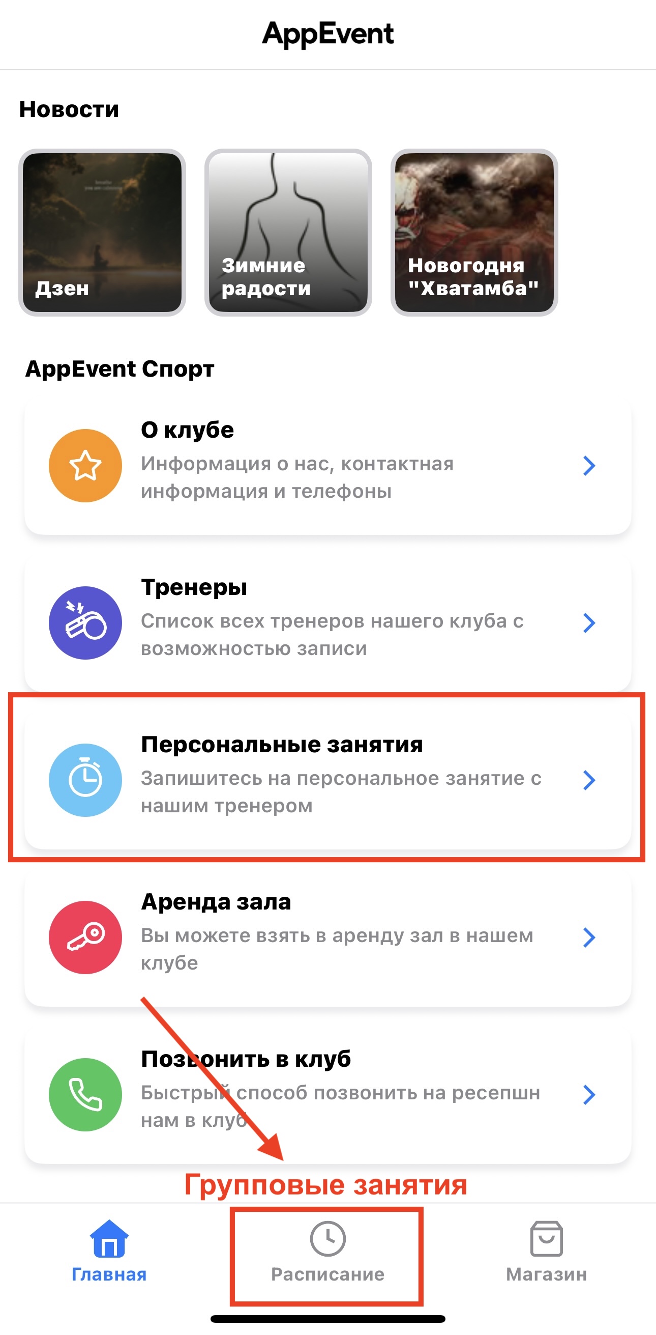 Клиент открывает расписание и выбирает нужное занятие — групповое или персональное. Сделать это можно как через виджет, так и через приложение.