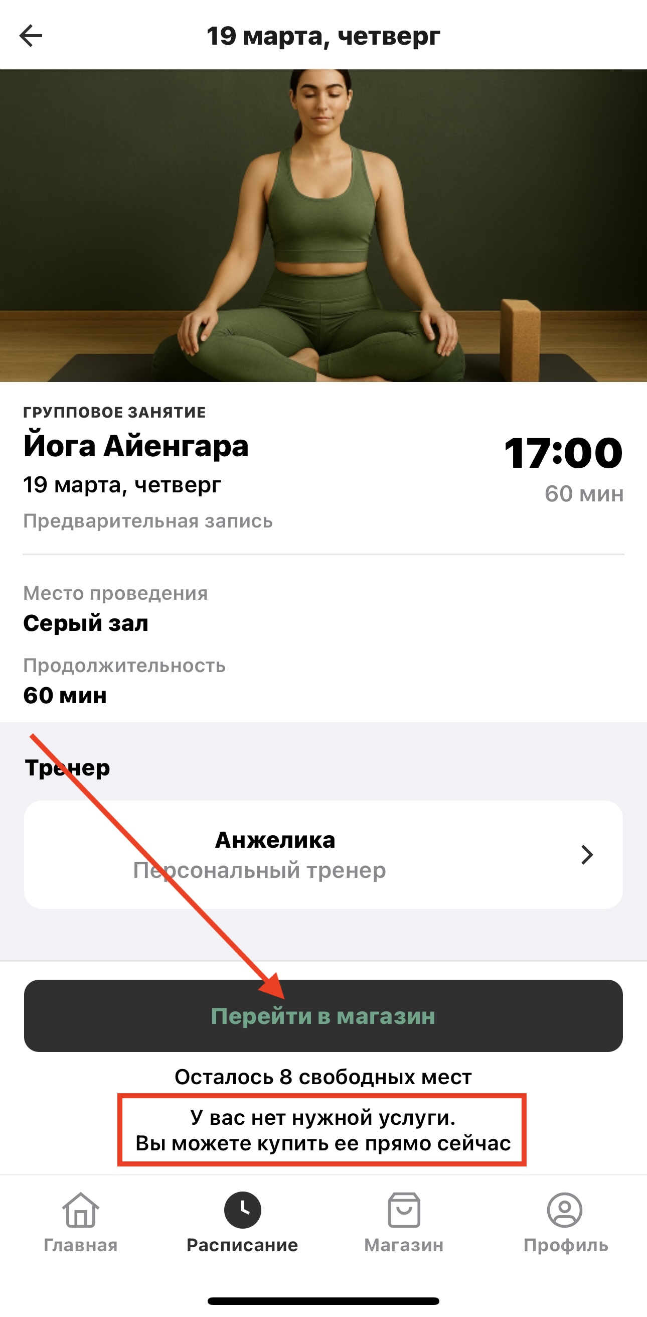 Система предлагает перейти в магазин, чтобы приобрести услугу.