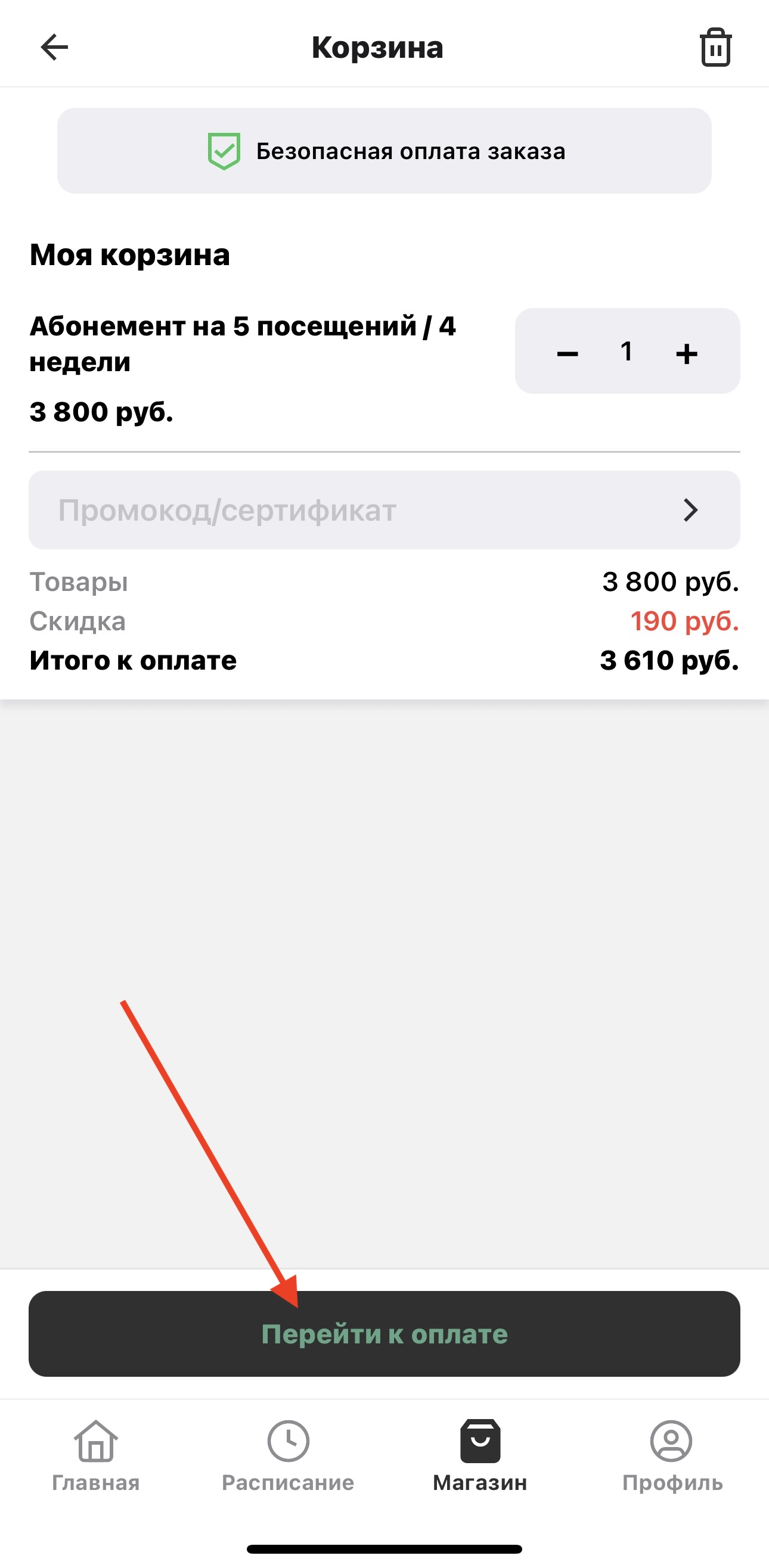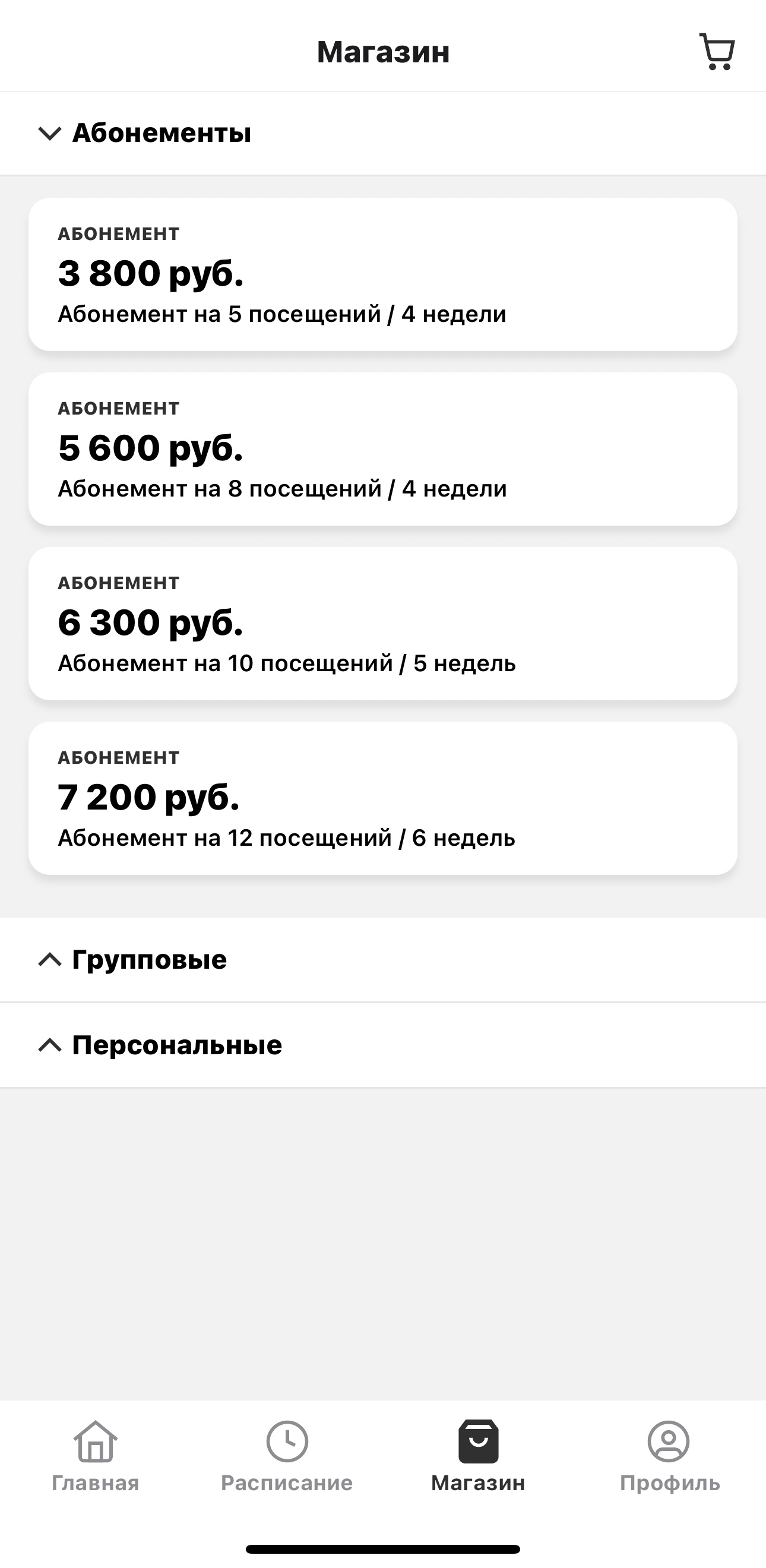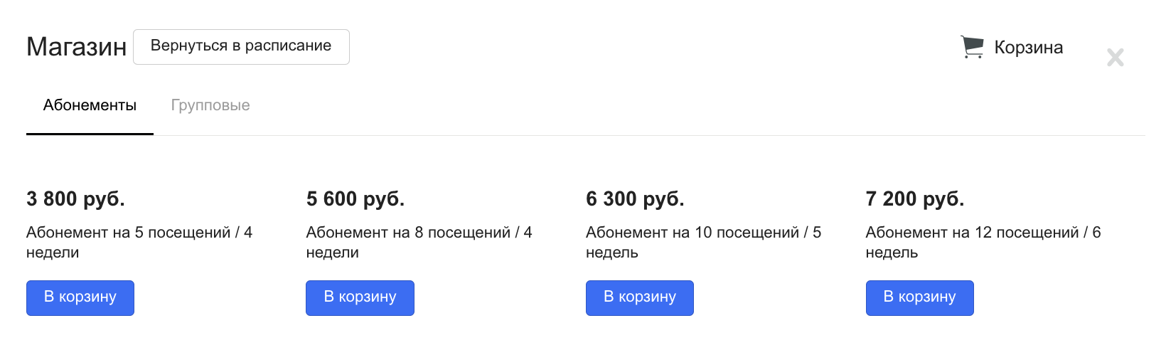 Клиент нажимает «Перейти в магазин» и видит список услуг и абонементов, которые вы отметили как доступные для продажи через виджет.