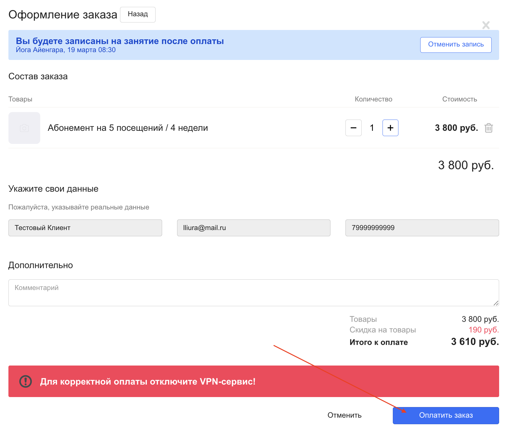 выбирает подходящую услугу или абонемент;