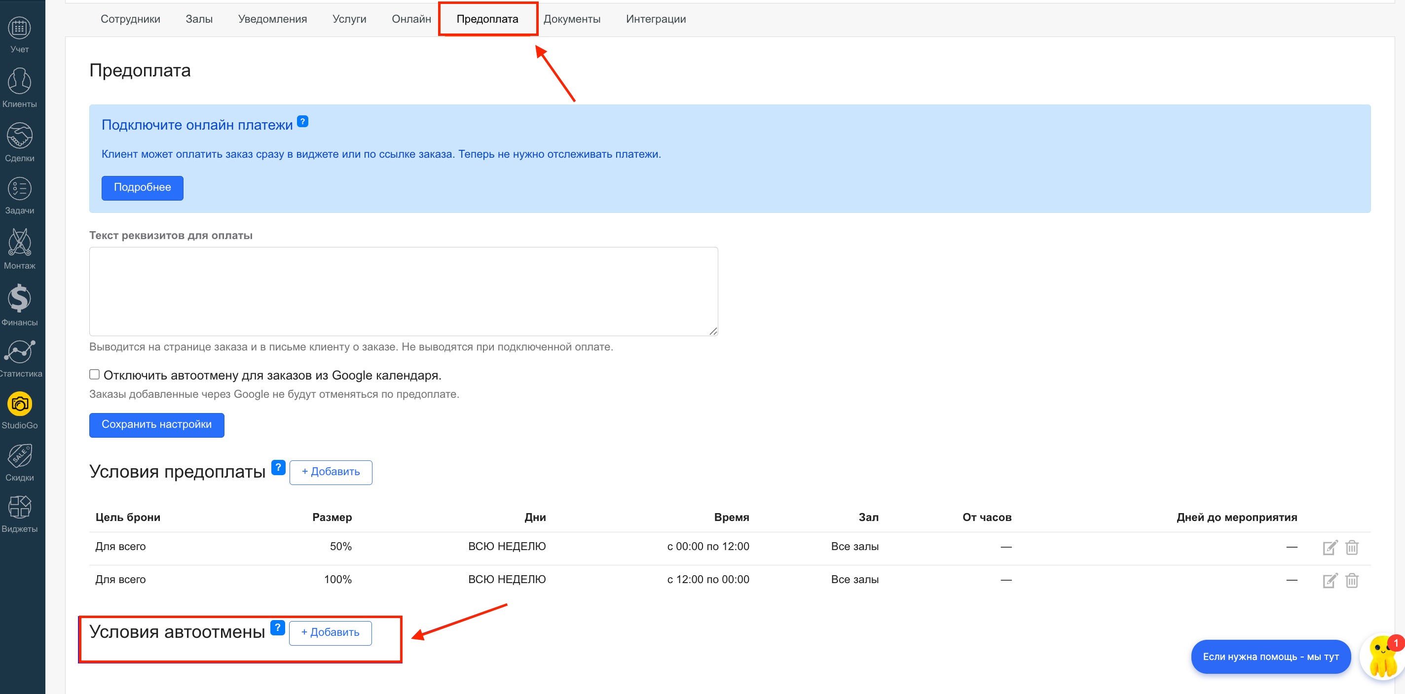 Важно: автоотмена работает только при наличии условий предоплаты. Как настроить предоплату — в статье «Настройка условий предоплаты».